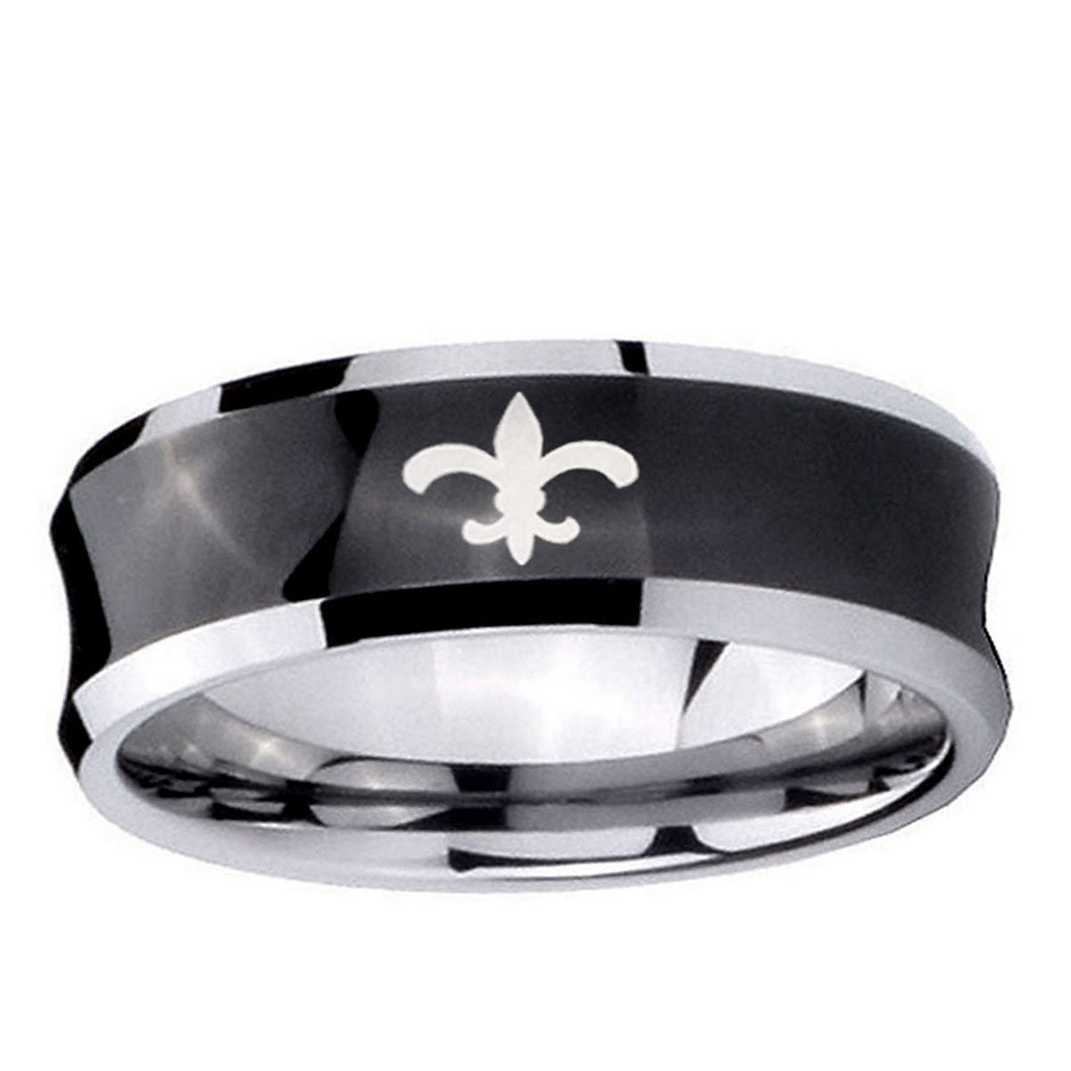 Intruding 5, 8mm Fleur-De-Lis Concave Black Tungsten Carbide Men's Engagement Band . Offer in both 5mm and 8mm band width black plated two tone finished from size 4 to 14