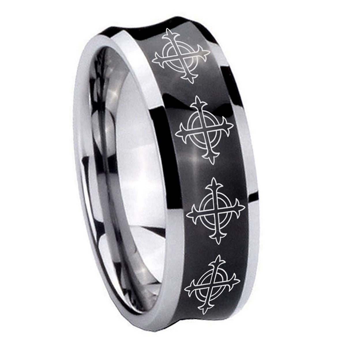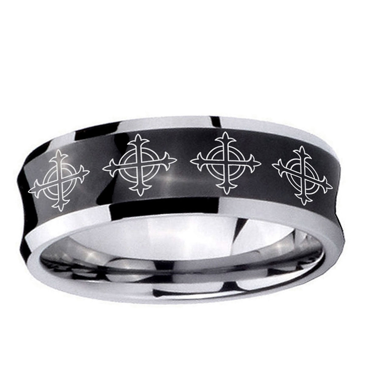 Celebrate with the 10mm Multiple Crosses Concave Black Tungsten Carbide Mens Wedding Band. This concave black tungsten ring with Multiple Crosses design is perfect for weddings.