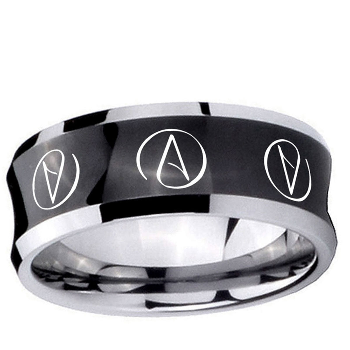 Intruding 5, 8mm Atheist Design Concave Black Tungsten Mens Anniversary Ring . Offer in both 5mm and 8mm band width black plated two tone finished from size 4 to 14