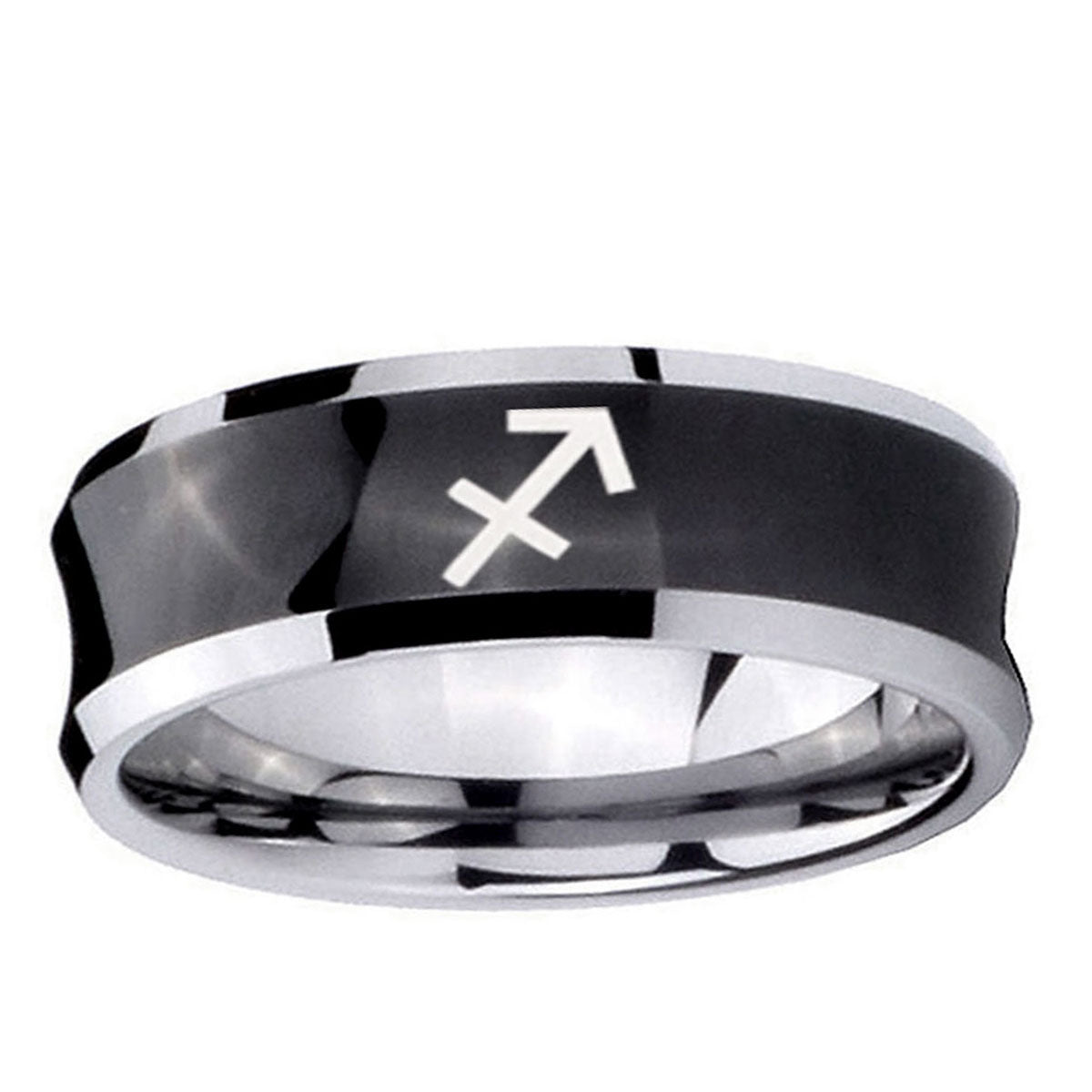 Intruding 5, 8mm Sagittarius Zodiac Concave Black Tungsten Carbide Mens Ring Engraved . Offer in both 5mm and 8mm band width black plated two tone finished from size 4 to 14