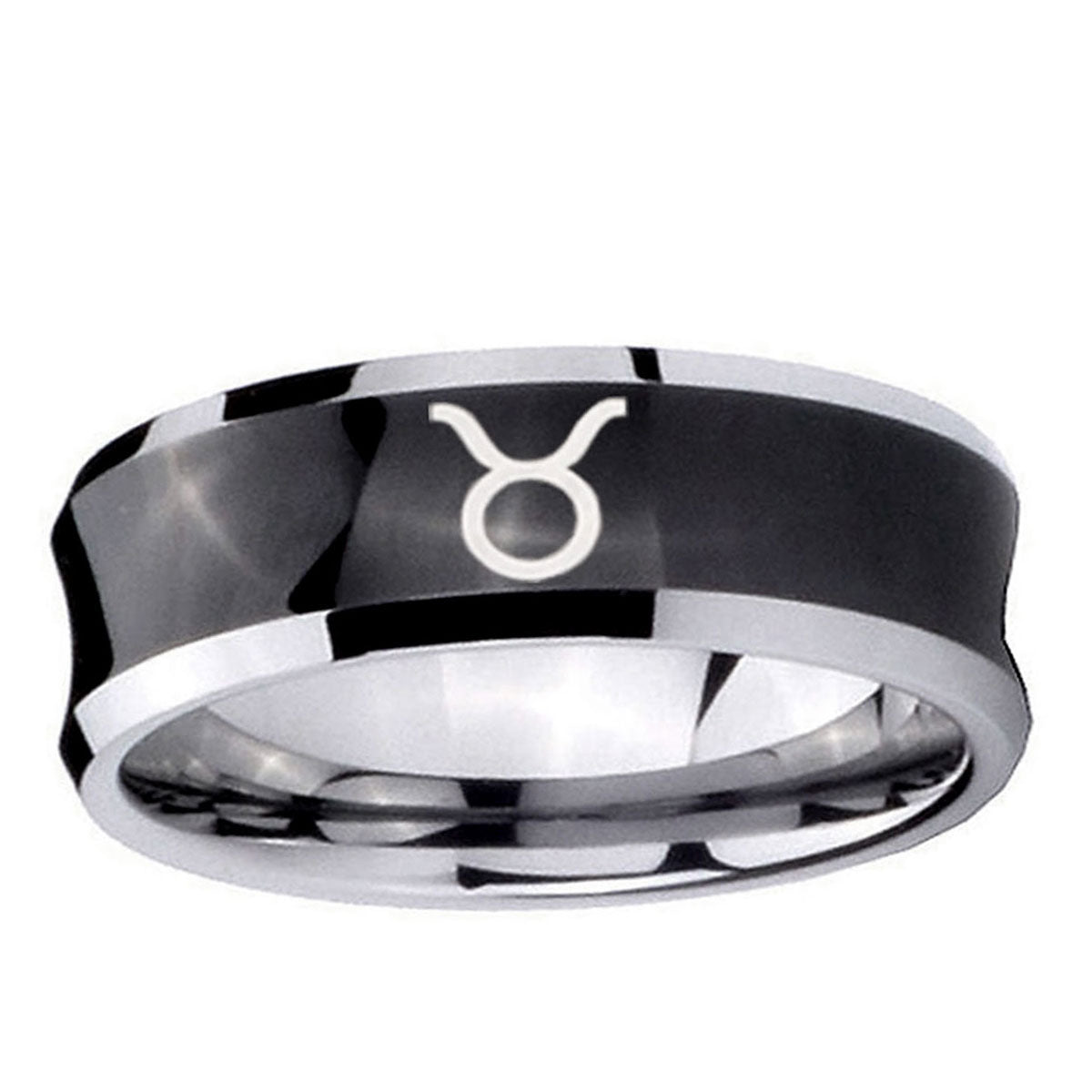 Intruding 5, 8mm Taurus Horoscope Concave Black Tungsten Carbide Mens Wedding Band . Offer in both 5mm and 8mm band width black plated two tone finished from size 4 to 14