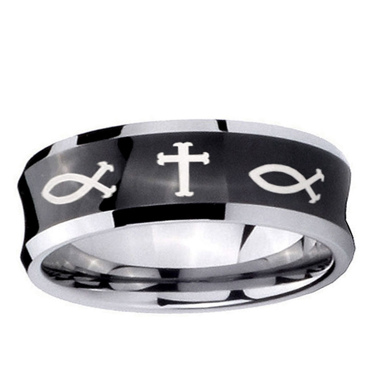 Celebrate with the 10mm Fish & Cross Concave Black Tungsten Carbide Wedding Bands Ring. This concave black tungsten ring with Fish & Cross design is perfect for weddings.