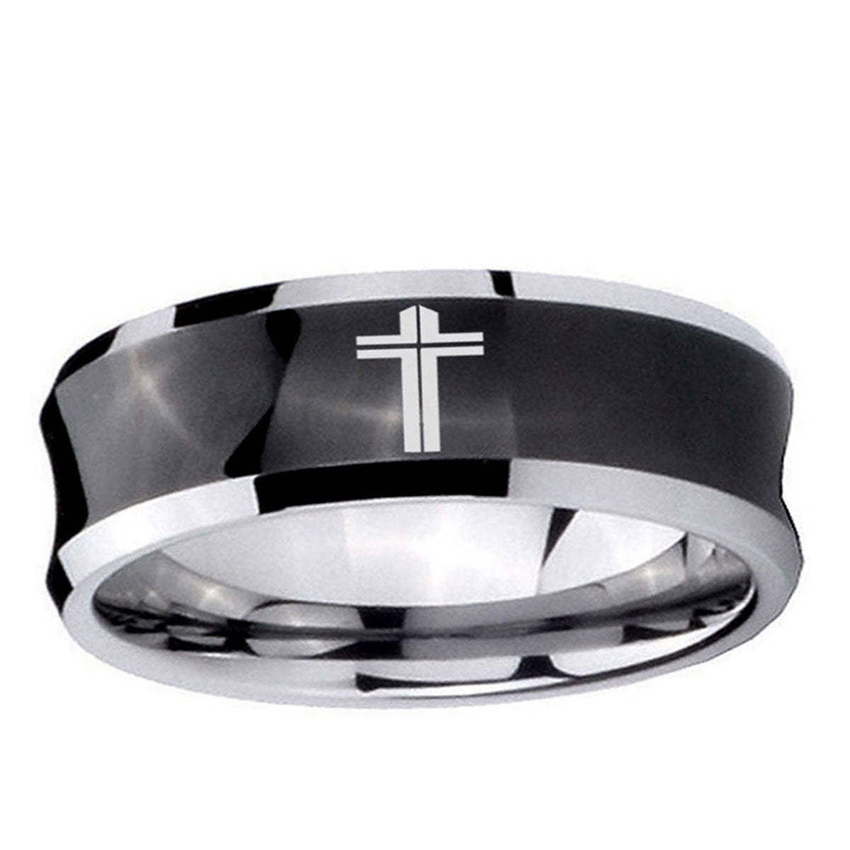 Intruding 5, 8mm Flat Christian Cross Concave Black Tungsten Carbide Mens Wedding Band . Offer in both 5mm and 8mm band width black plated two tone finished from size 4 to 14
