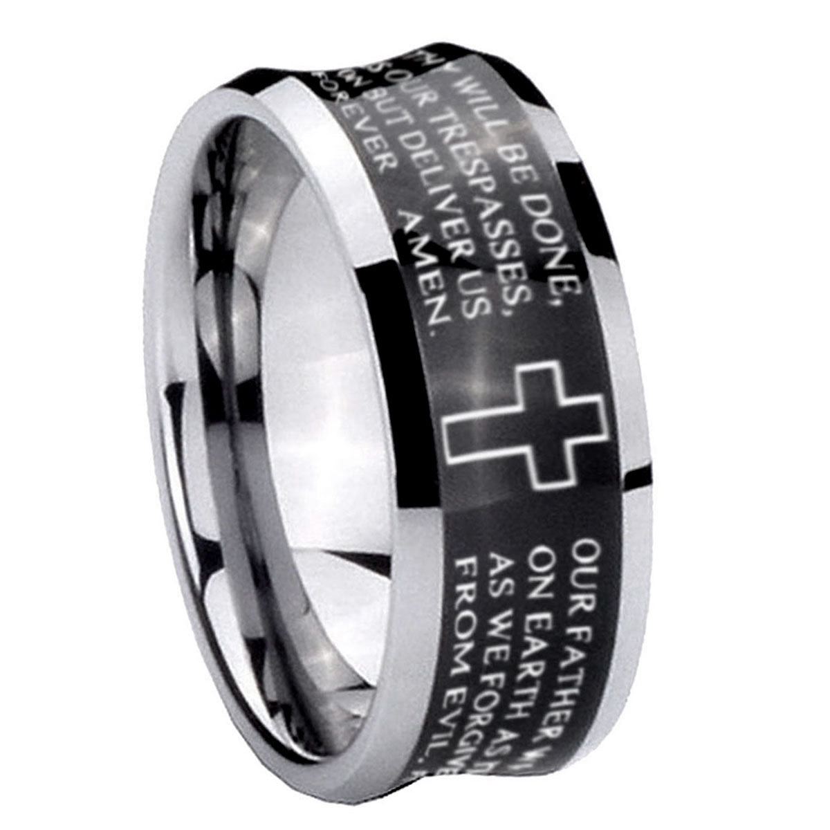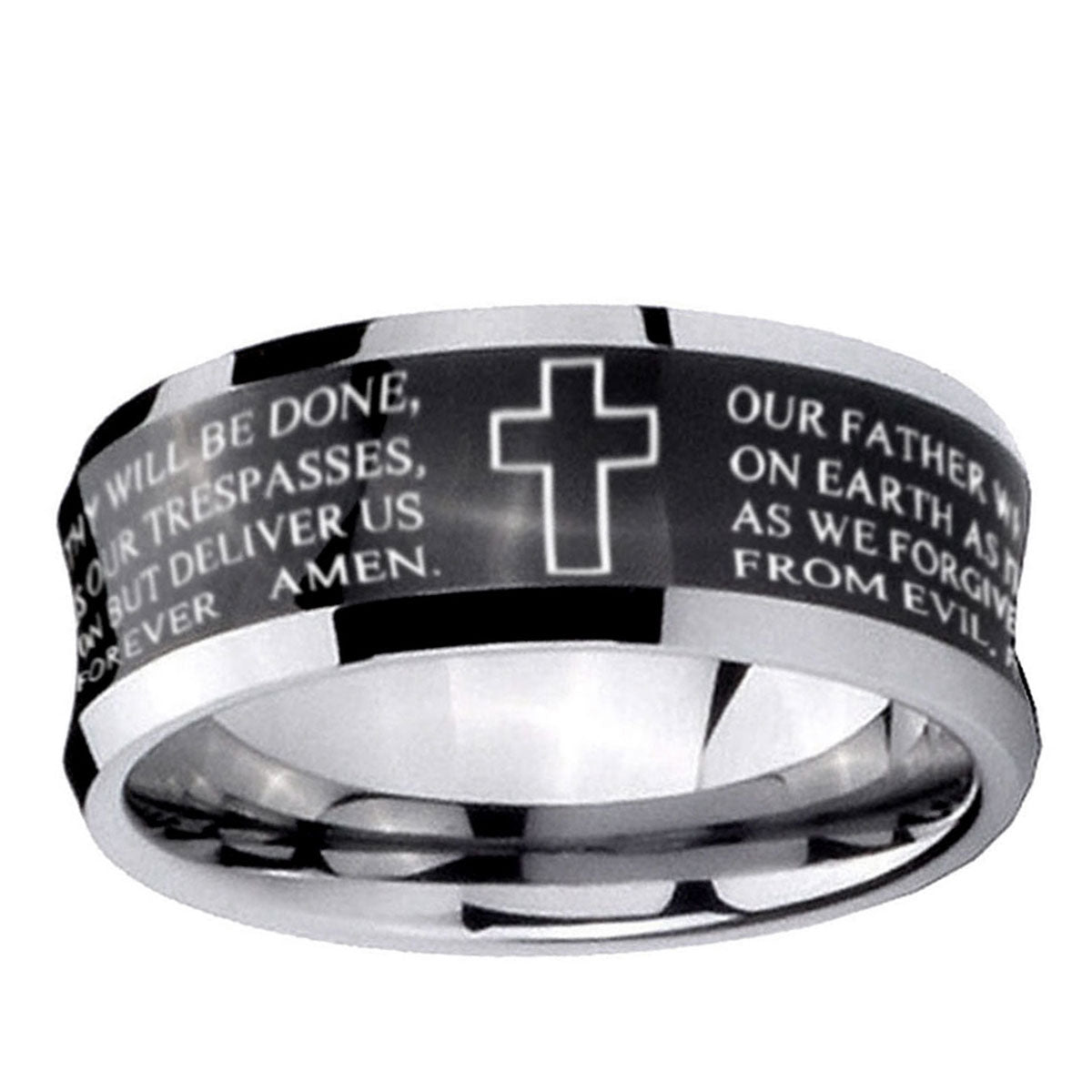 Intruding 5, 8mm Etched Lord's Prayer Cross Concave Black Tungsten Carbide Men's Ring . Offer in both 5mm and 8mm band width black plated two tone finished from size 4 to 14