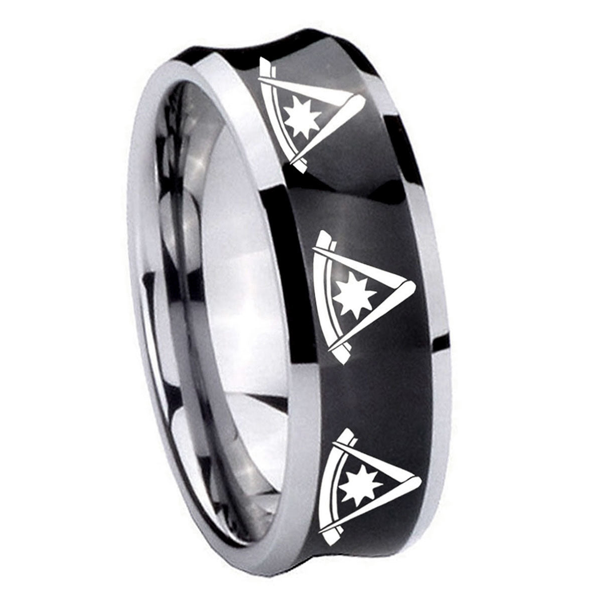 Customize the 10mm Multiple Pester Master Masonic Concave Black Tungsten Custom Mens Ring. This concave black tungsten ring with Multiple Pester Master Masonic design is perfect for personalization.