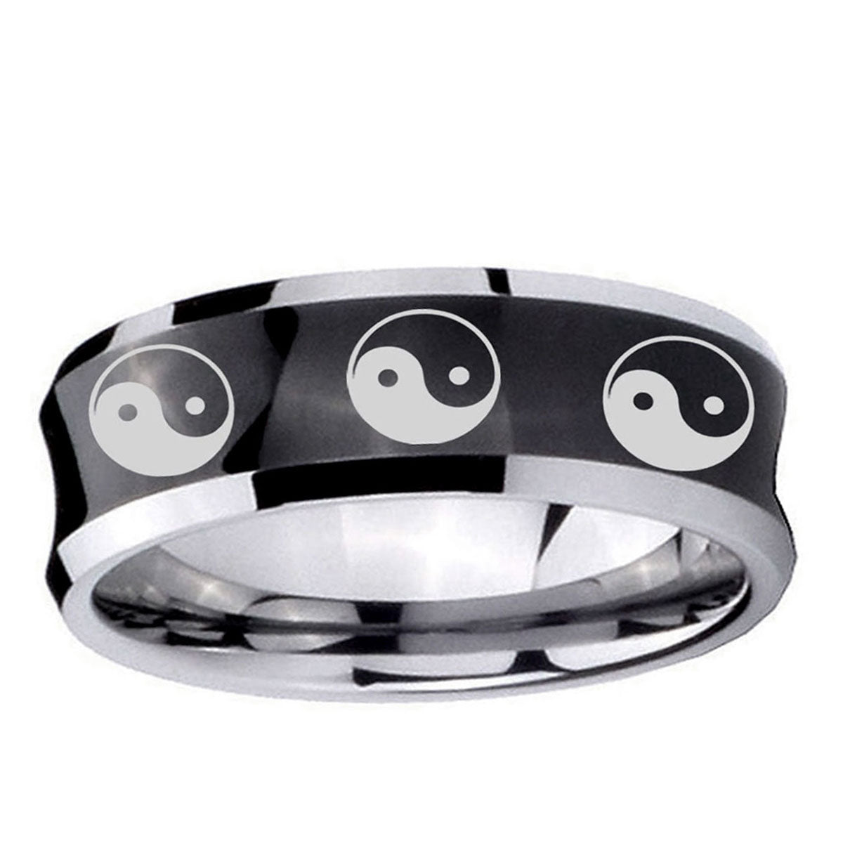 Intruding 5, 8mm Multiple Yin Yang Concave Black Tungsten Carbide Wedding Band Ring . Offer in both 5mm and 8mm band width black plated two tone finished from size 4 to 14
