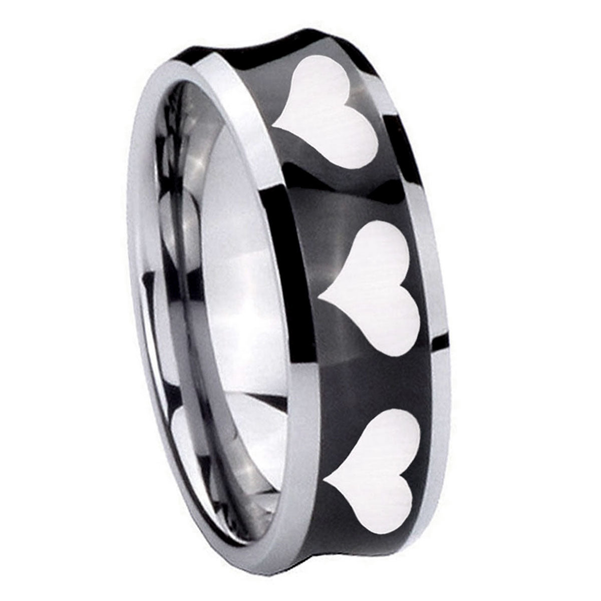 Style the 10mm Multiple Heart Concave Black Tungsten Carbide Men's Ring. This concave black tungsten ring with Multiple Heart design is perfect for men.