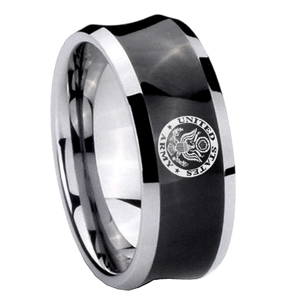 Intruding 5, 8mm U.S. Army Concave Black Tungsten Carbide Custom Ring for Men . Offer in both 5mm and 8mm band width black plated two tone finished from size 4 to 14