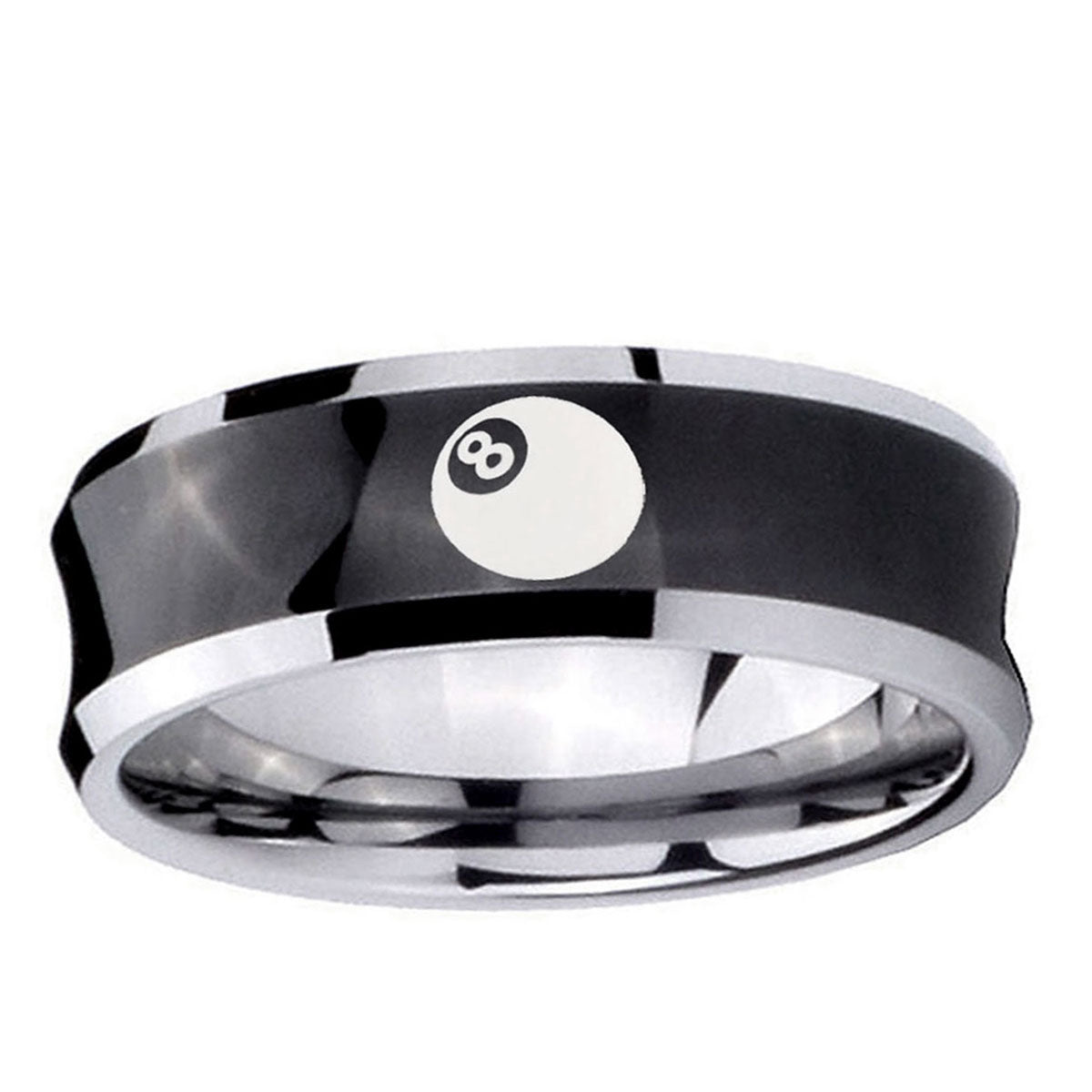 Celebrate love with the 10mm 8 Ball Concave Black Tungsten Carbide Mens Wedding Ring. This concave black ring with 8-ball accents is crafted from durable tungsten for a lasting impression.