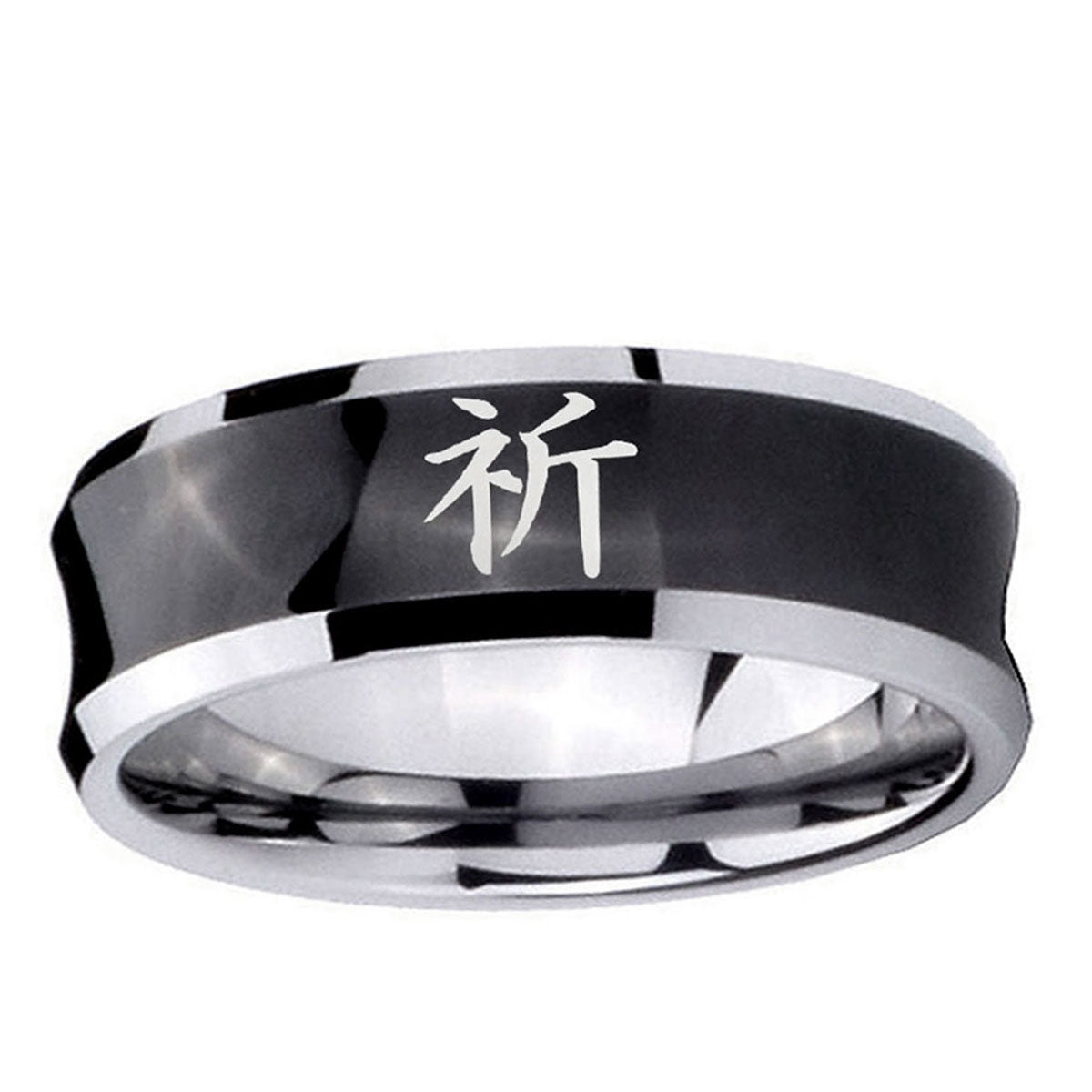 Celebrate with the 10mm Kanji Prayer Concave Black Tungsten Carbide Wedding Band Mens. This concave black tungsten ring with Kanji Prayer design is perfect for weddings.
