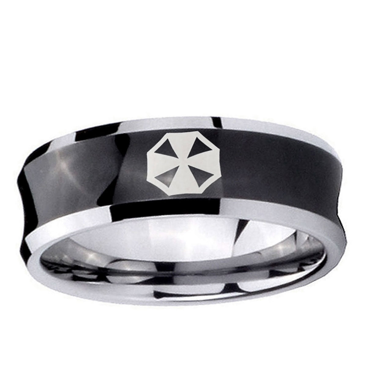 Intruding 5, 8mm Resident Evil Concave Black Tungsten Carbide Custom Ring for Men . Offer in both 5mm and 8mm band width black plated two tone finished from size 4 to 14