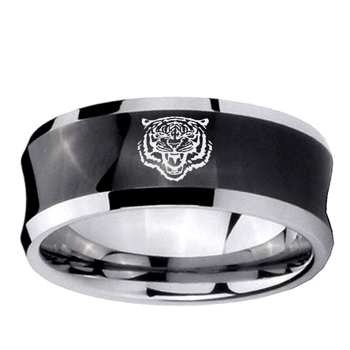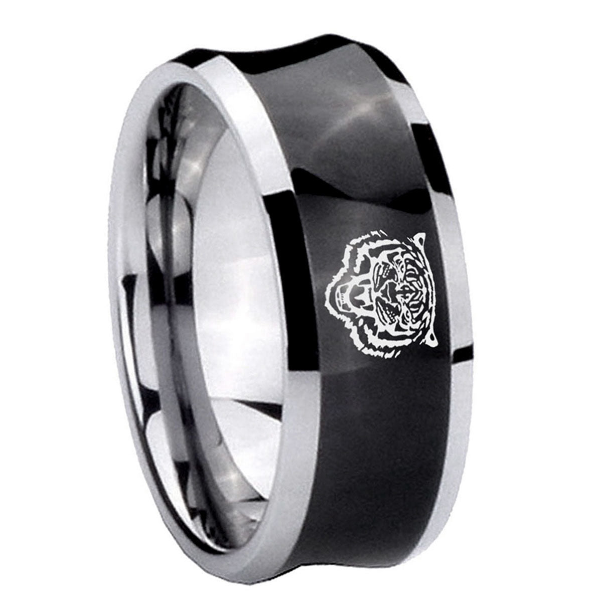 Intruding 5, 8mm Lion Concave Black Tungsten Carbide Men's Ring . Offer in both 5mm and 8mm band width black plated two tone finished from size 4 to 14