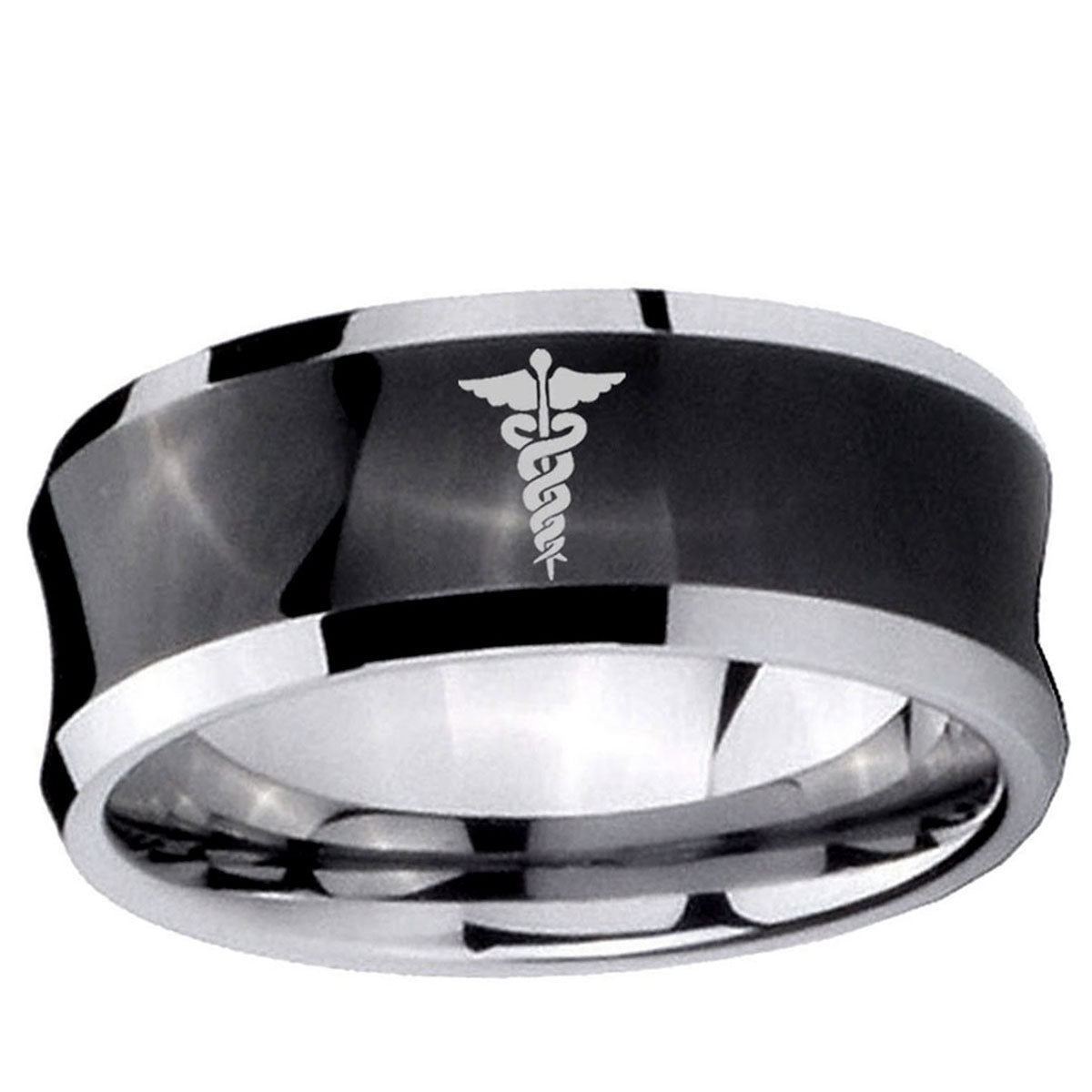Propose with the 10mm Medical Symbol Concave Black Tungsten Carbide Men's Engagement Band. This concave black tungsten ring with Medical Symbol design is ideal for engagements.
