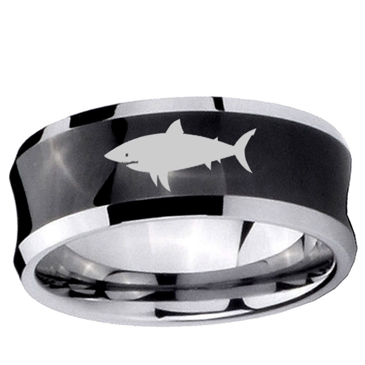 Propose with the 10mm Shark Concave Black Tungsten Carbide Men's Engagement Band. This concave black tungsten ring with Shark design is ideal for engagements.