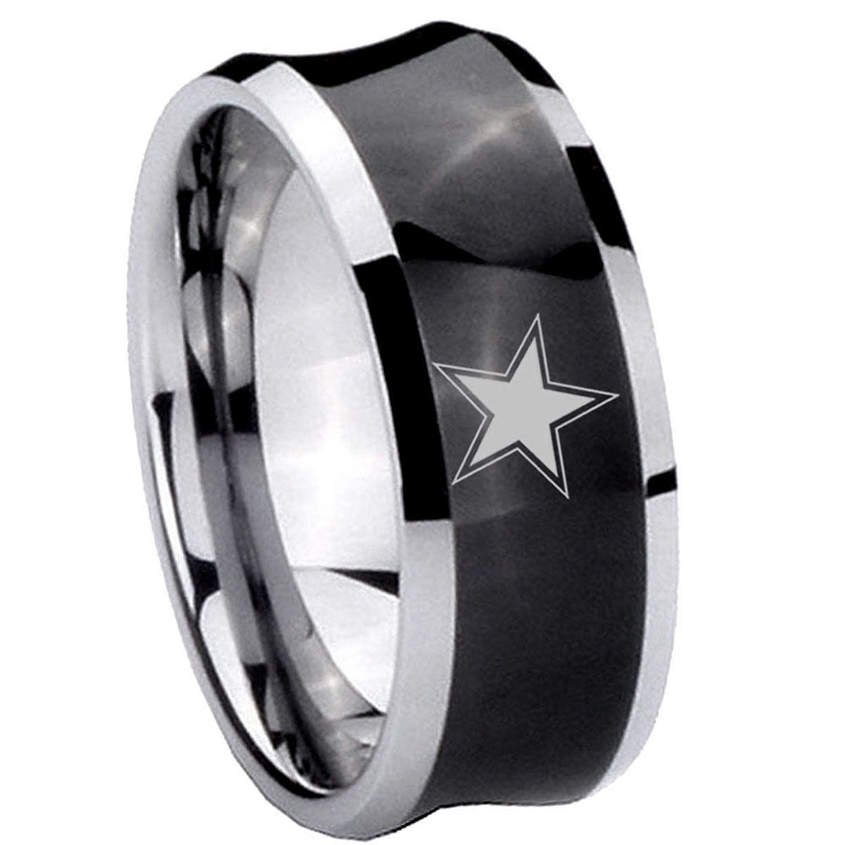 Propose with the 10mm Cowboys Star Concave Black Tungsten Carbide Men's Engagement Band. This concave black tungsten ring with Cowboys Star design is ideal for engagements.