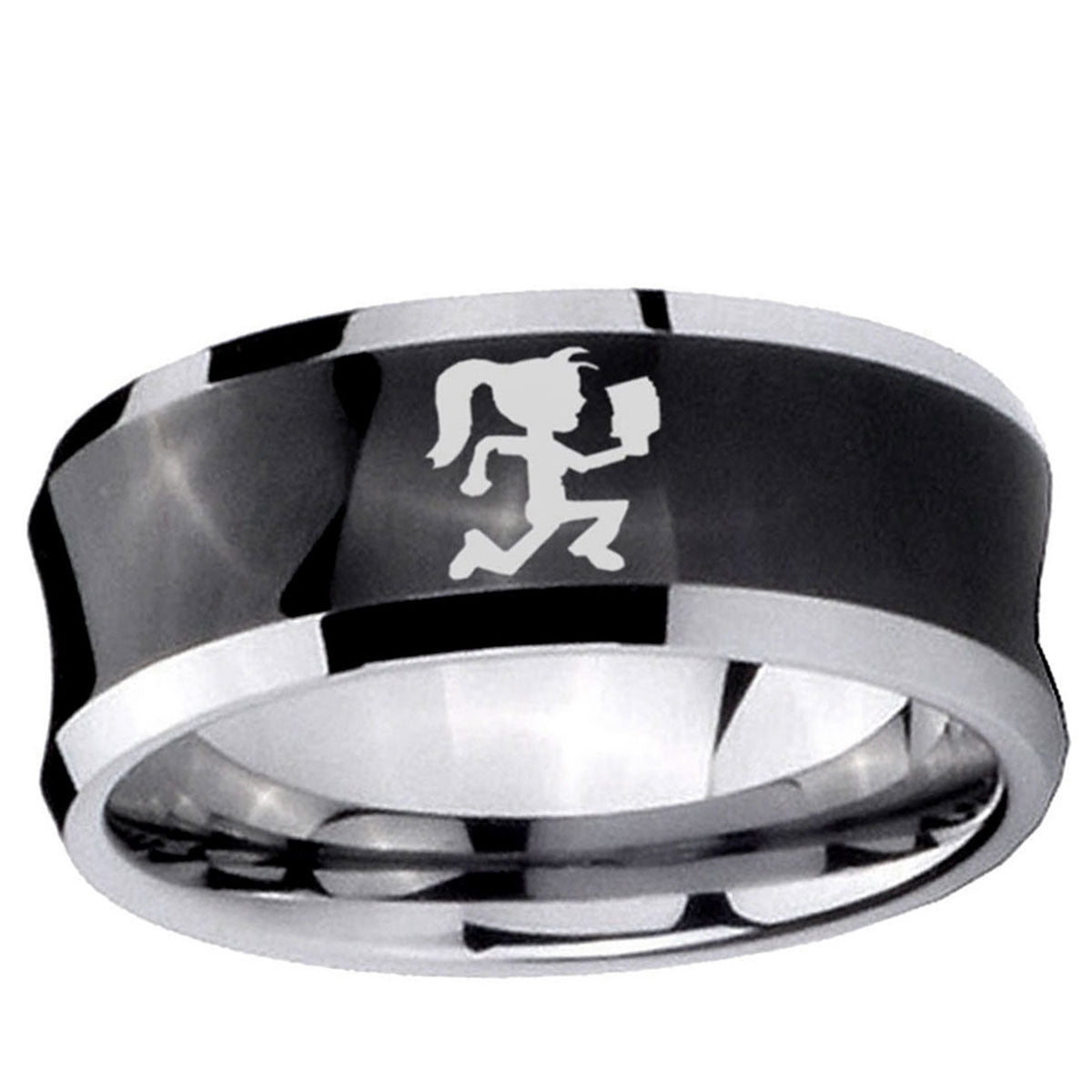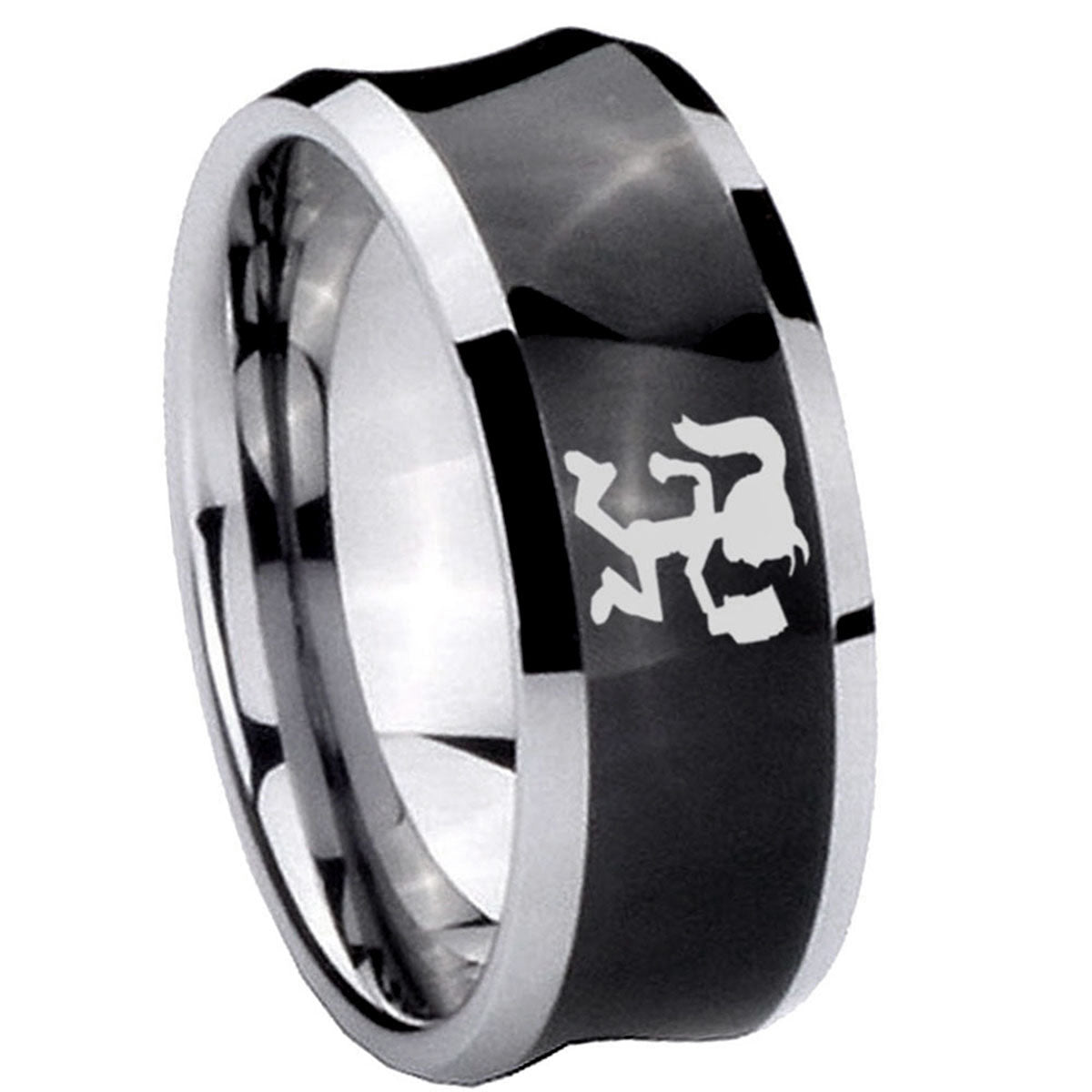 Intruding 5, 8mm Hatchet Woman Concave Black Tungsten Carbide Men's Ring . Offer in both 5mm and 8mm band width black plated two tone finished from size 4 to 14