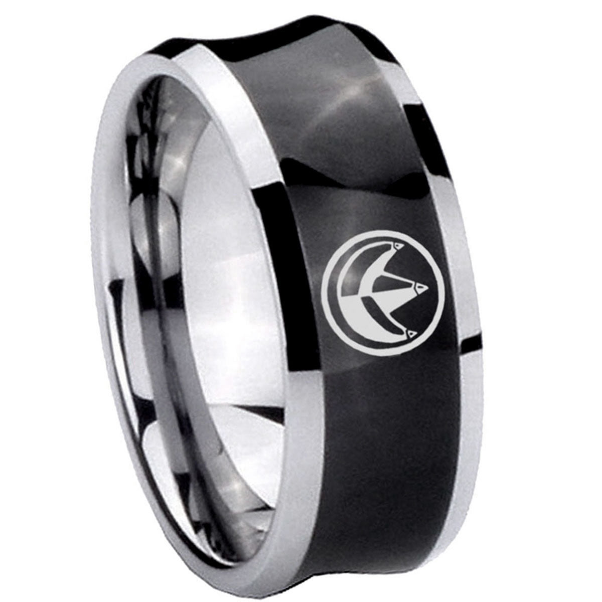 Intruding 5, 8mm Green Ranger Power Concave Black Tungsten Carbide Men's Ring . Offer in both 5mm and 8mm band width black plated two tone finished from size 4 to 14