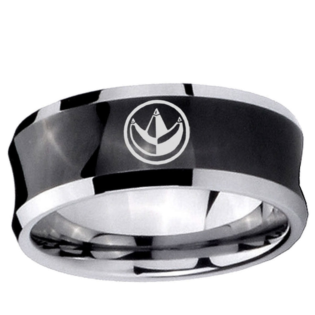 Propose with the 10mm Green Ranger Power Concave Black Tungsten Carbide Men's Engagement Band. This concave black tungsten ring with Green Ranger Power design is ideal for engagements.