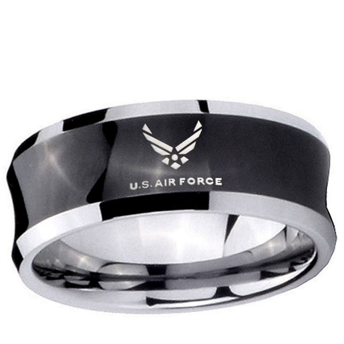 Intruding 5, 8mm Black Concave US Air Force Two Tone Tungsten Carbide Laser Engraved Ring . Offer in both 5mm and 8mm band width black plated two tone finished from size 4 to 14