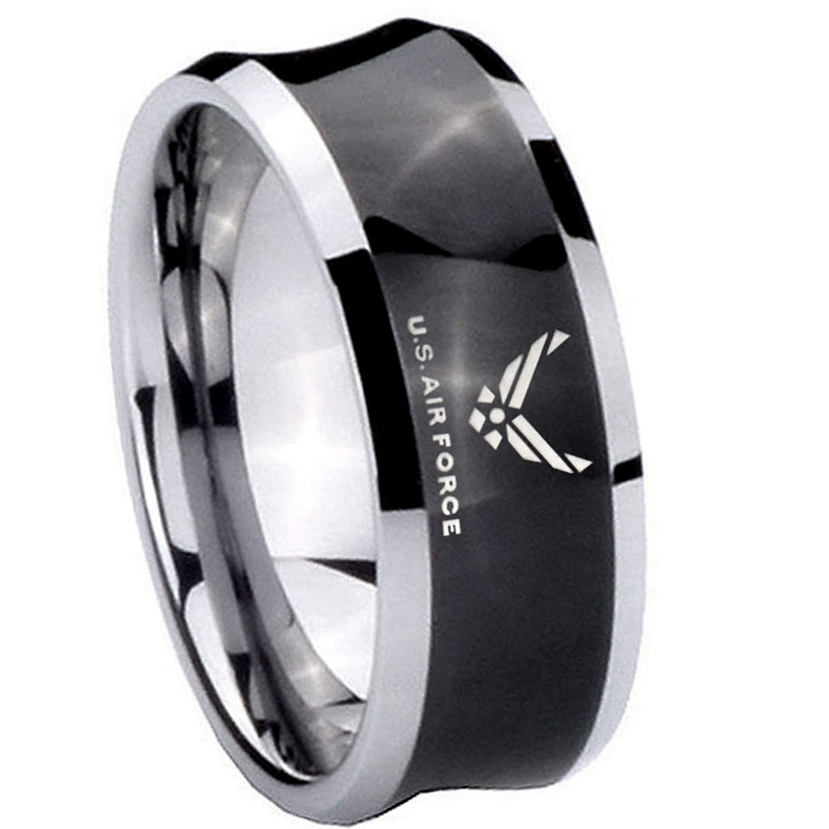Honor service with the 10mm Concave US Air Force Tungsten Carbide Black IP Two Tone Men's Ring. This concave black and 2-tone tungsten ring with US Air Force design is perfect for veterans.