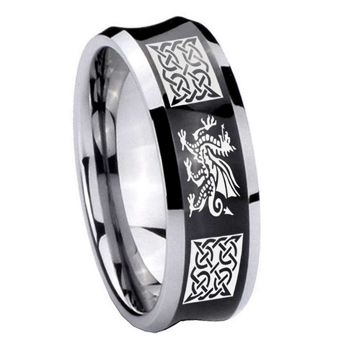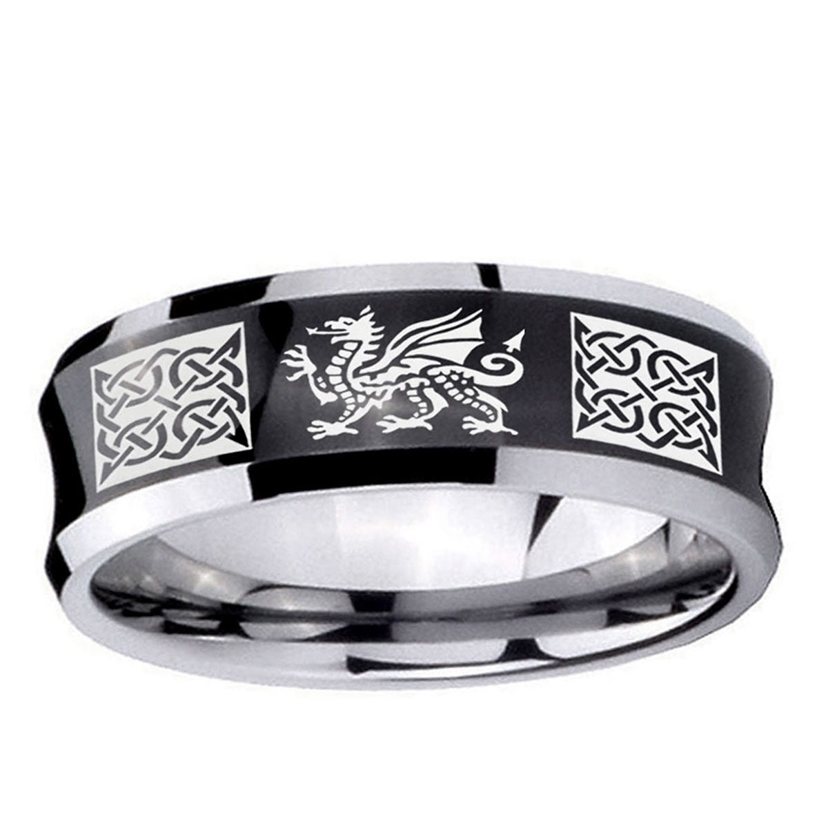 Intruding 5, 8mm Multiple Dragon Celtic Concave Black Tungsten Carbide Men's Band Ring . Offer in both 5mm and 8mm band width black plated two tone finished from size 4 to 14