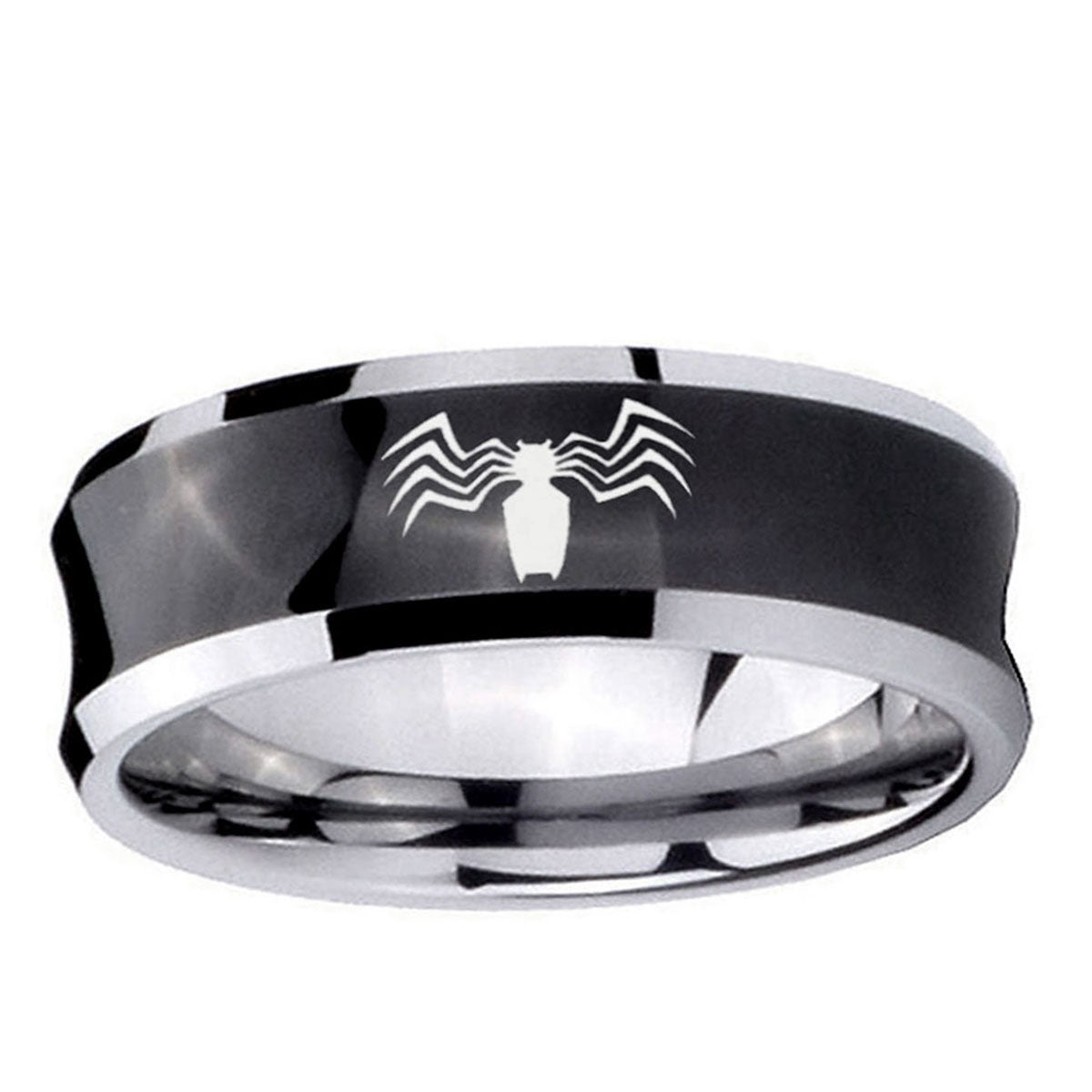 Celebrate with the 10mm Spider Concave Black Tungsten Carbide Men's Wedding Ring. This concave black tungsten ring with Spider design is perfect for weddings.