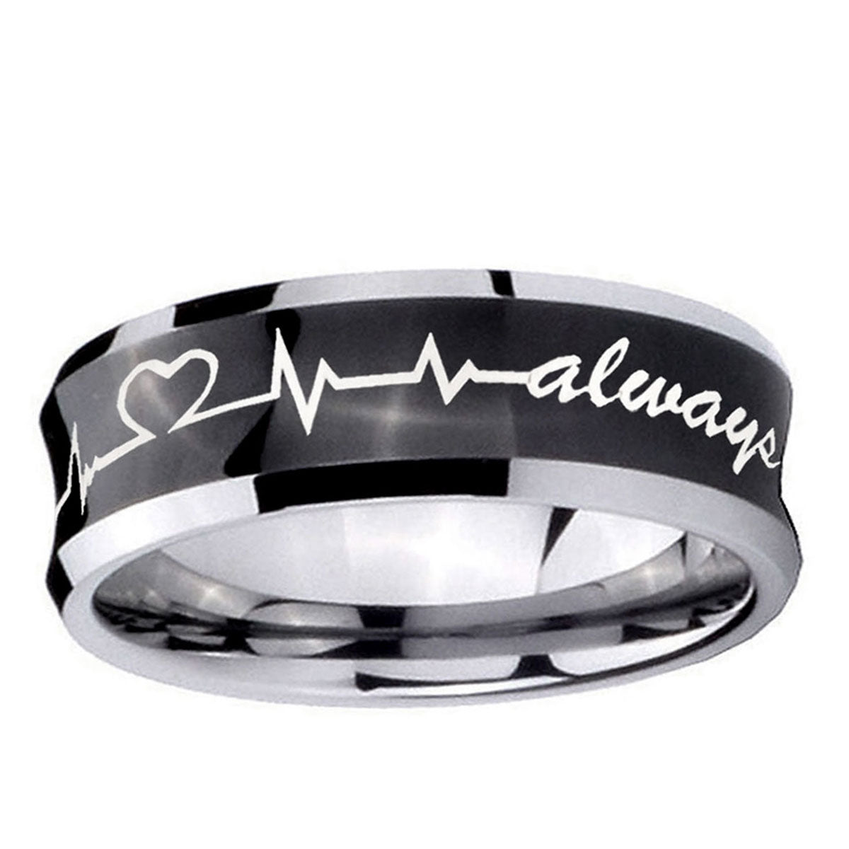 Customize the 10mm Heart Beat forever Heart always Concave Black Tungsten Custom Ring for Men. This concave black tungsten ring with Heart Beat design is perfect for personalization.