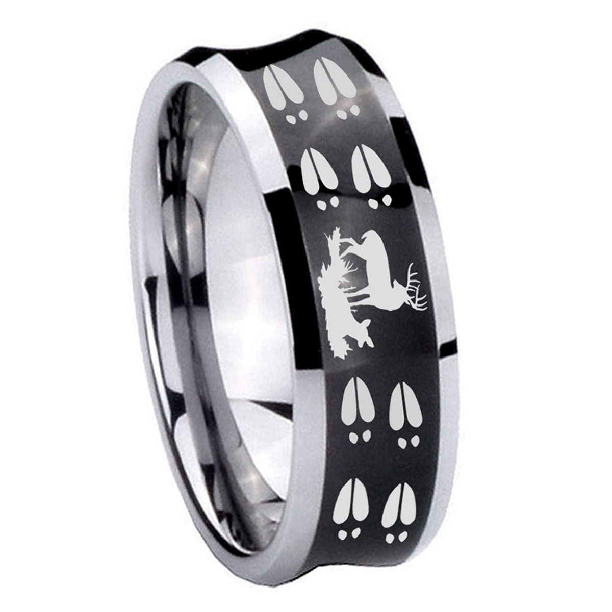 Intruding 5, 8mm Deer Hunting Tracks Concave Black Tungsten Carbide Mens Anniversary Ring . Offer in both 5mm and 8mm band width black plated two tone finished from size 4 to 14