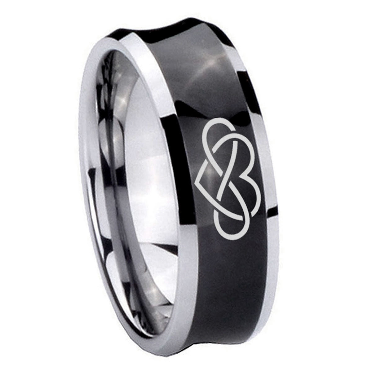 Celebrate with the 10mm Infinity Love Concave Black Tungsten Carbide Mens Wedding Band. This concave black tungsten ring with Infinity Love design is perfect for weddings.