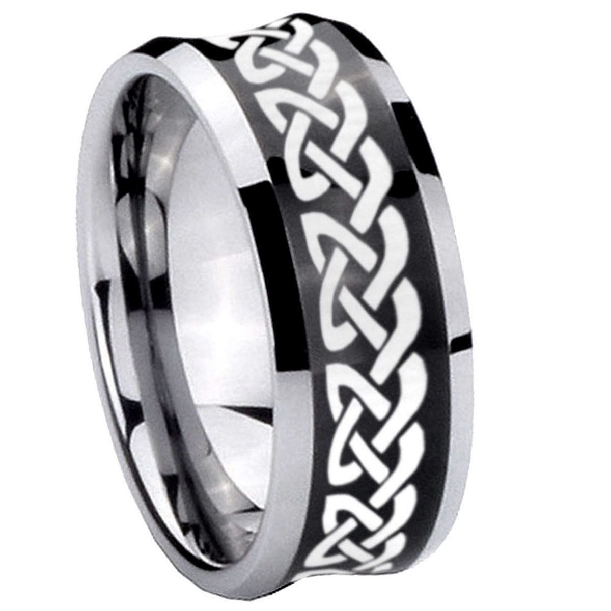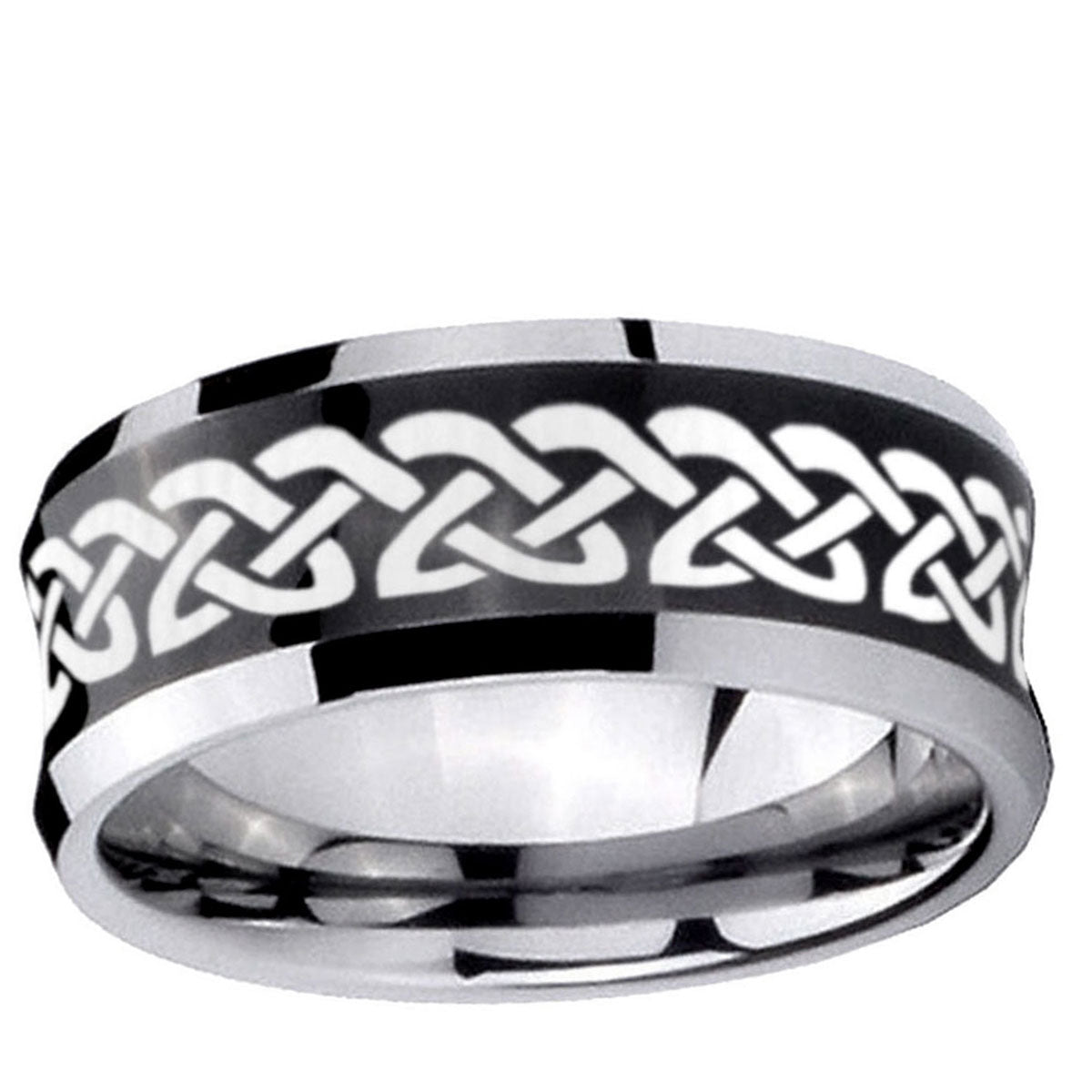 Intruding 5, 8mm Celtic Knot Love Concave Black Tungsten Carbide Custom Ring for Men . Offer in both 5mm and 8mm band width black plated two tone finished from size 4 to 14