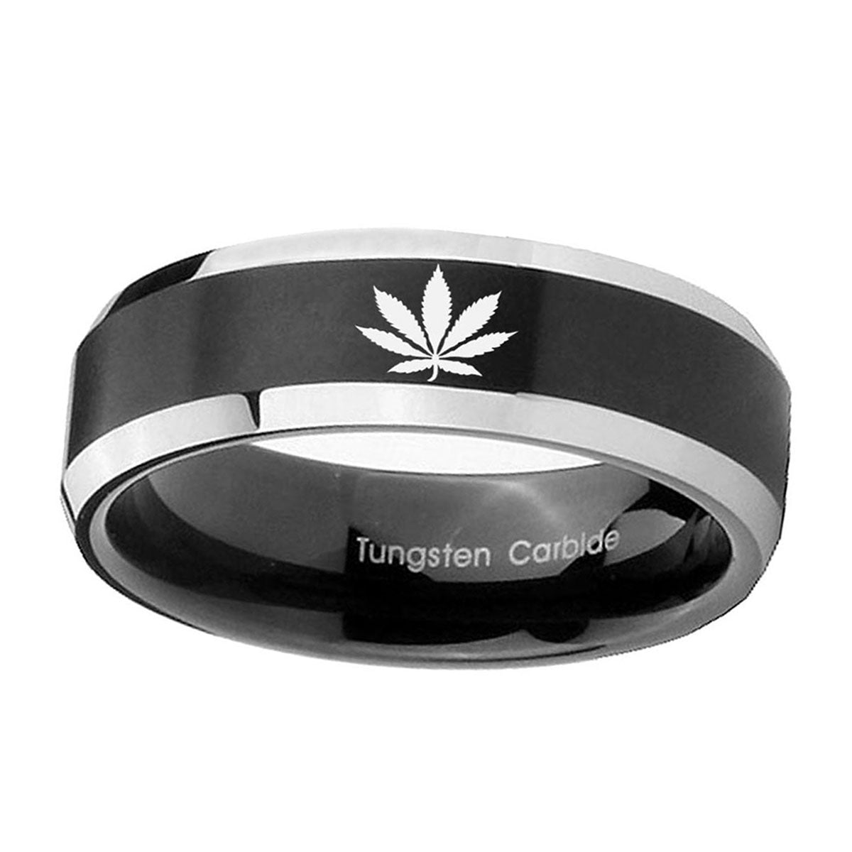 Style the 10mm Marijuana Leaf Beveled Edges Brush Black 2 Tone Tungsten Men's Band Ring. This brushed black and 2-tone tungsten ring with Marijuana Leaf design is perfect for men.
