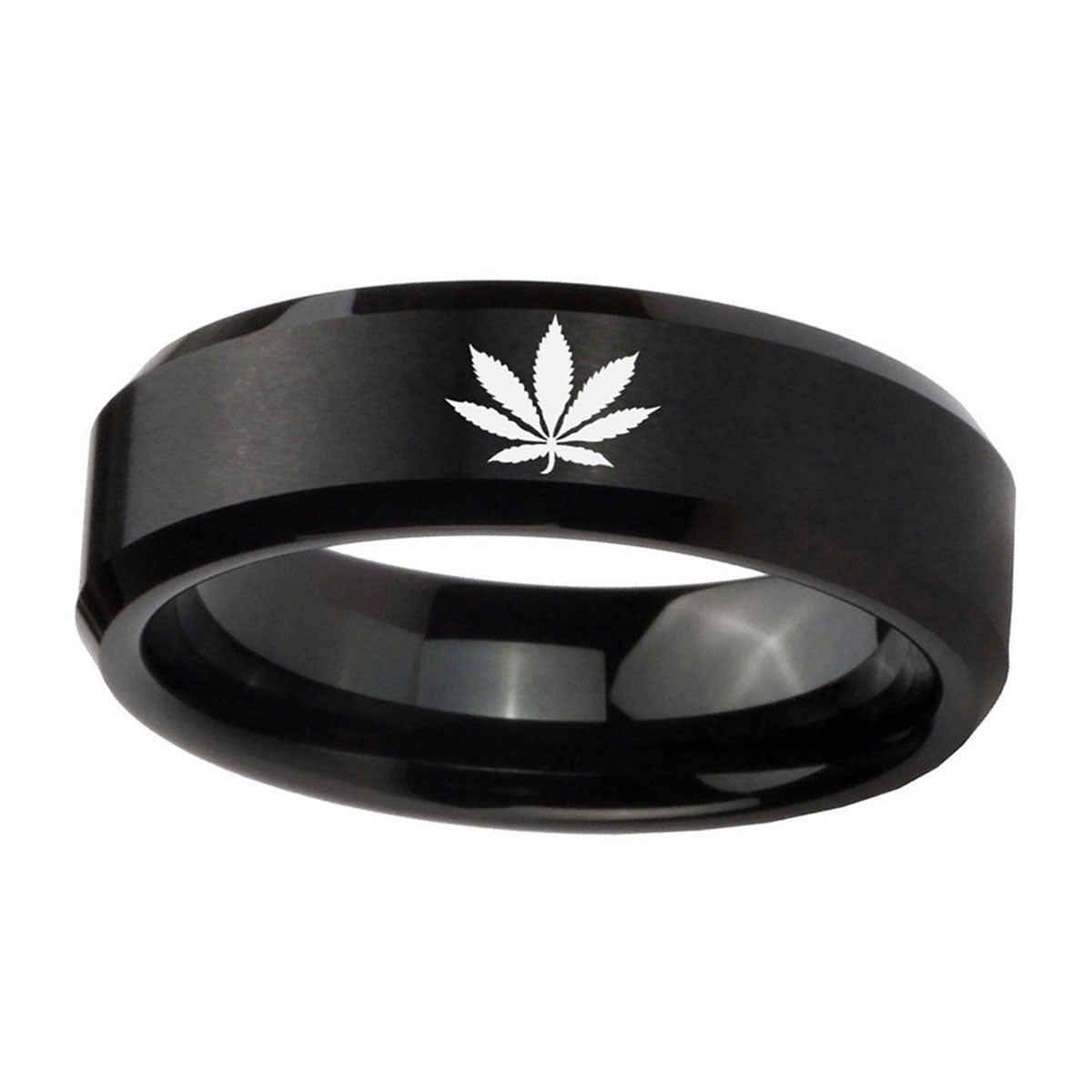 5, 8mm Marijuana Leaf Beveled Edges Brush Black Tungsten Carbide Bands Ring