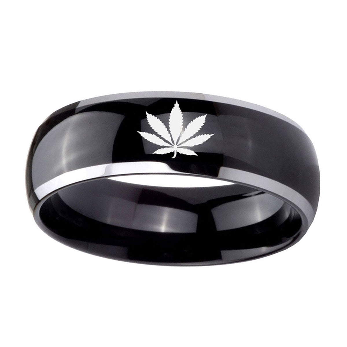 Introuding 5, 8mm Marijuana Leaf Dome Glossy Black 2 Tone Tungsten Carbide Engraved Ring . Offer in both 5mm and 8mm band width polished black plated two tone finished from size 4 to 14