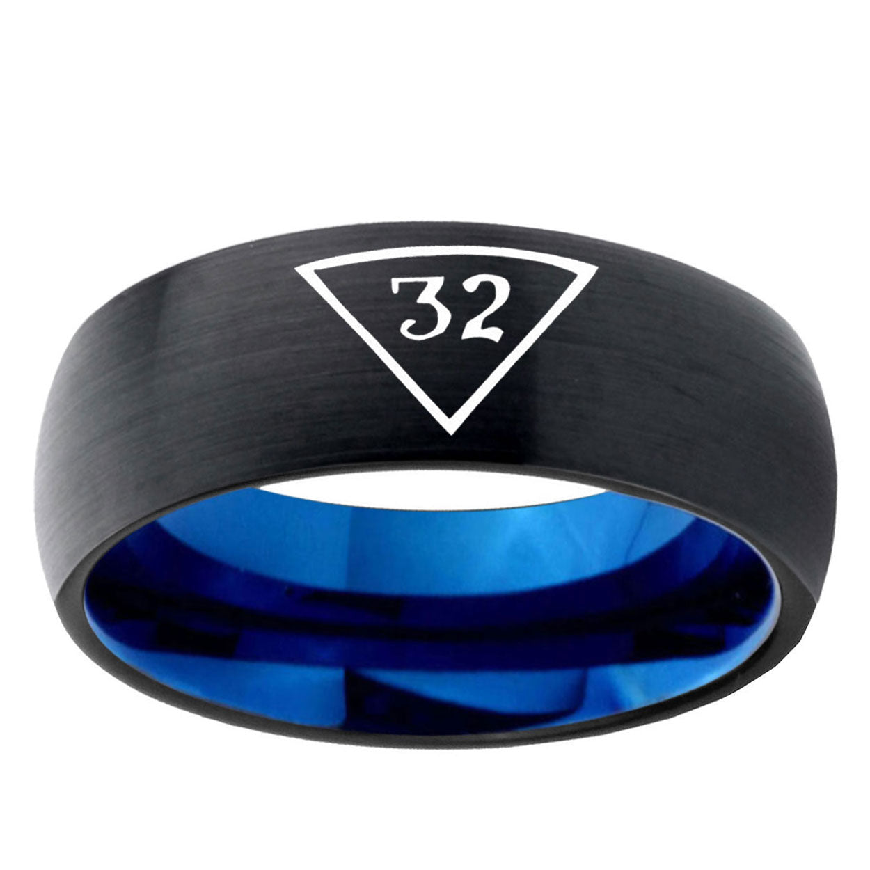 Intruding 5, 8mm Masonic 32 Triangle Freemason Dome Black And Blue Tungsten Carbide Men's Wedding Ring . Offer in both 5mm and 8mm band width black and blue plated finished from size 4 to 14