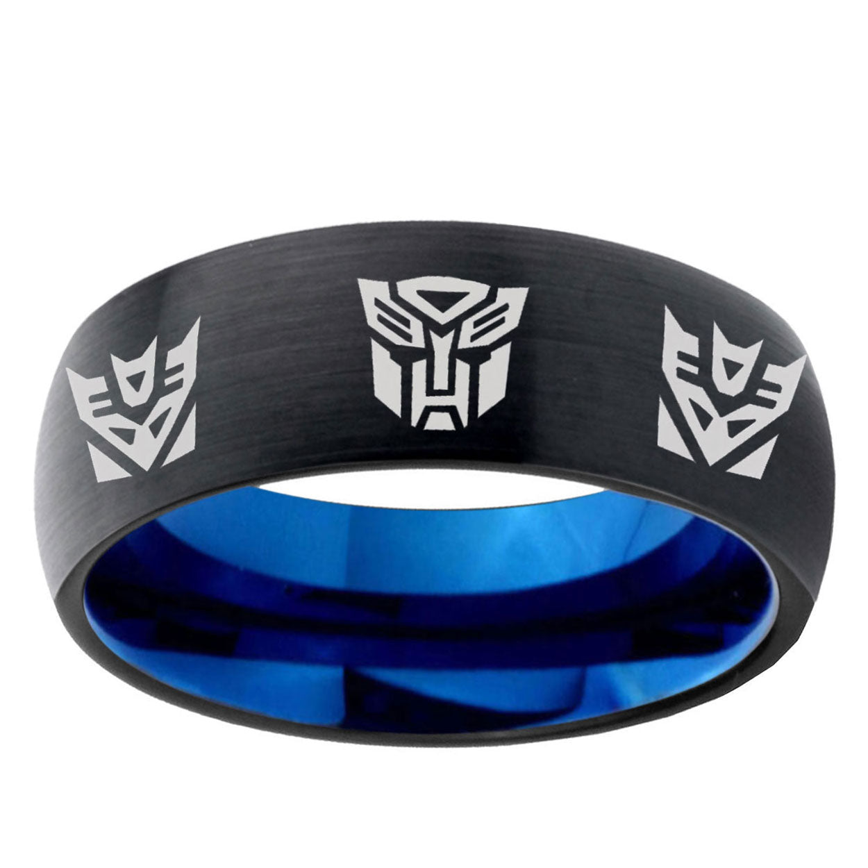 Intruding 5, 8mm Transformers Autobot Decepticon Dome Black And Blue Tungsten Carbide Men's Wedding Band . Offer in both 5mm and 8mm band width black and blue plated finished from size 4 to 14