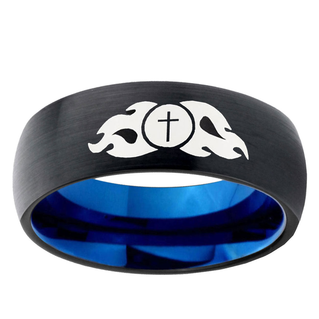 Intruding 5, 8mm Flamed Cross Dome Black And Blue Tungsten Carbide Wedding Band Ring . Offer in both 5mm and 8mm band width black and blue plated finished from size 4 to 14
