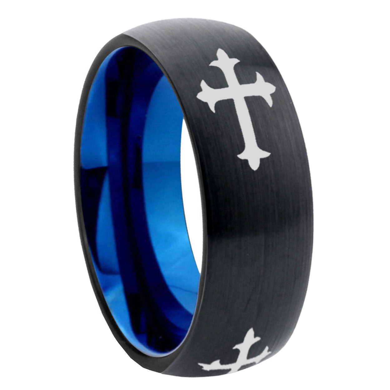 Intruding 5, 8mm Christian Cross Religious Dome Tungsten Carbide Blue Wedding Band Mens . Offer in both 5mm and 8mm band width black and blue plated finished from size 4 to 14