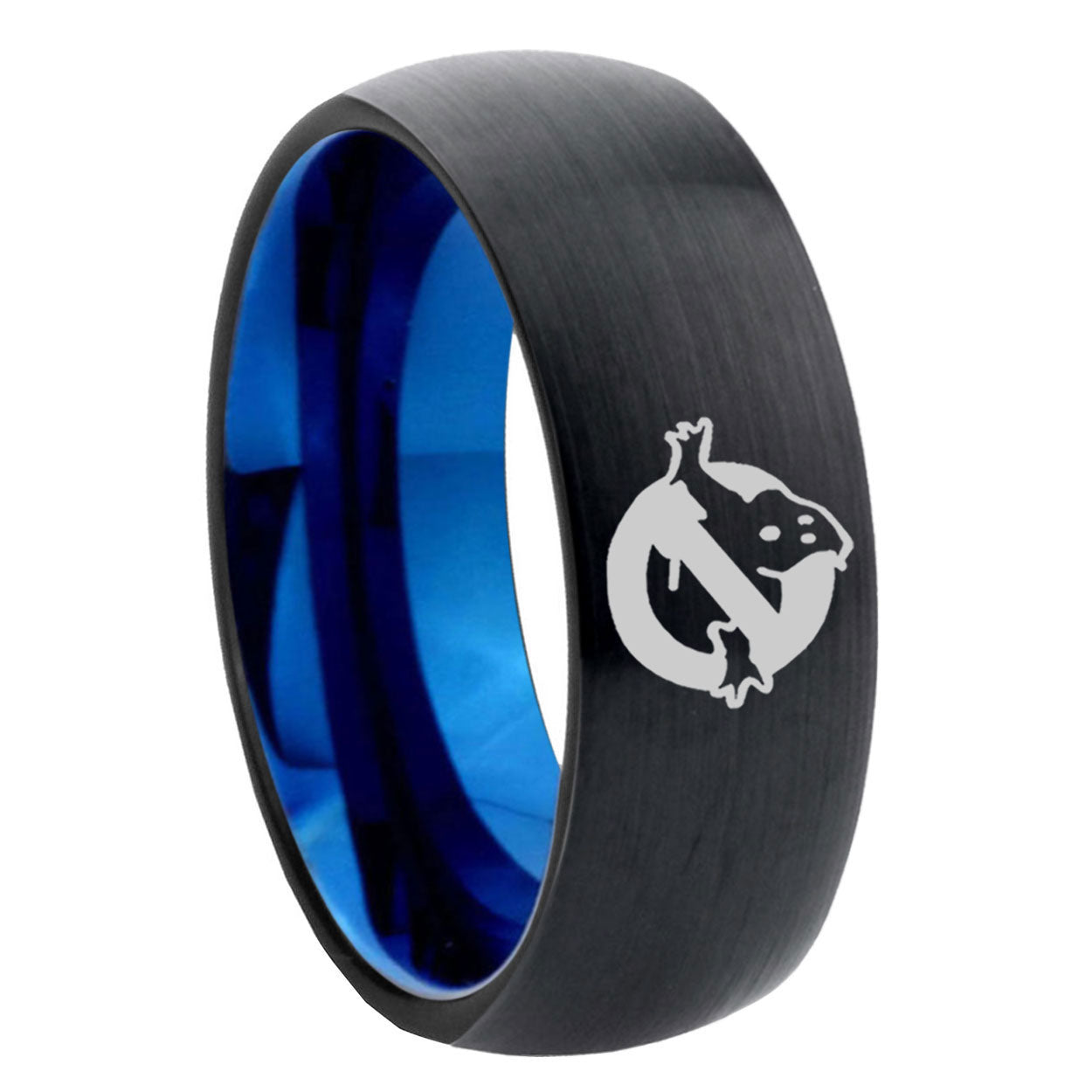 Intruding 5, 8mm Ghostbusters Dome Tungsten Carbide Blue Engagement Ring . Offer in both 5mm and 8mm band width black and blue plated finished from size 4 to 14