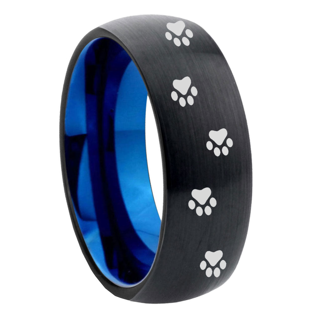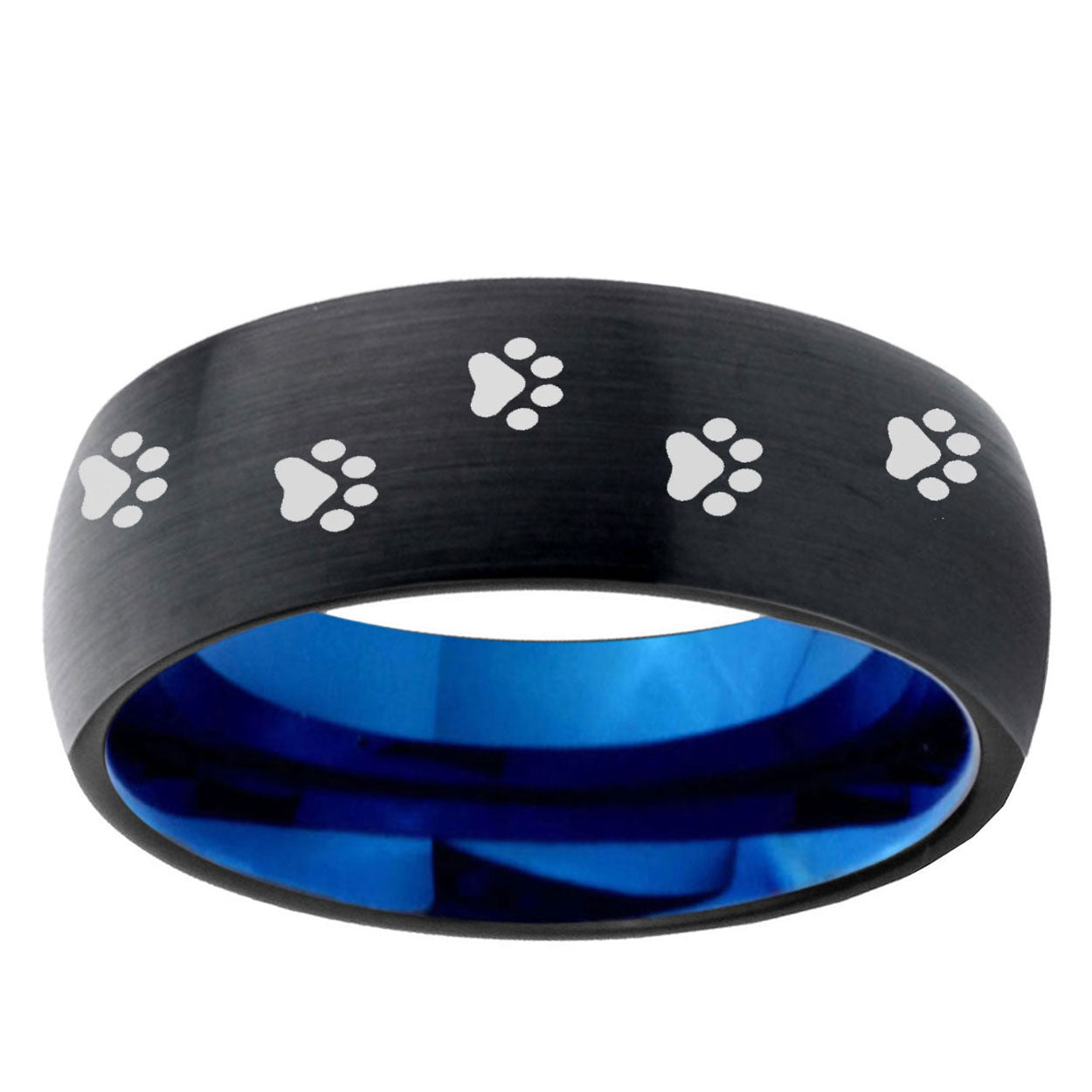 Intruding 5, 8mm Paw Print Design Dome Tungsten Carbide Blue Wedding Ring . Offer in both 5mm and 8mm band width black and blue plated finished from size 4 to 14