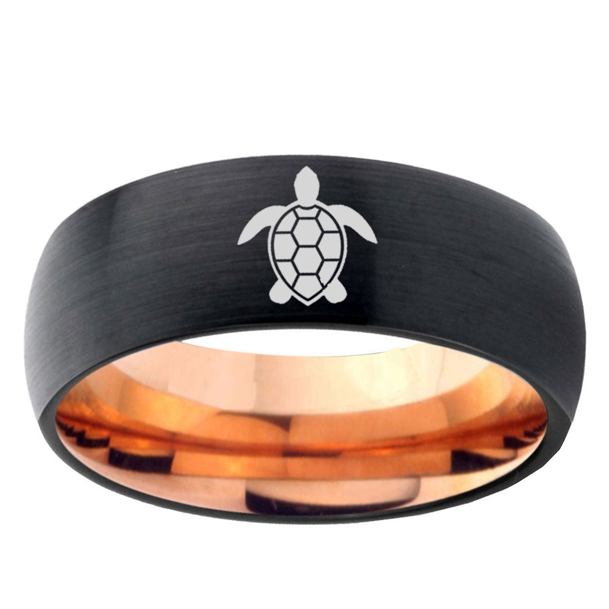 Intruding 5, 8mm Sea Turtle Dome Rose Gold Black Carbon Fiber Rings . Offer in both 5mm and 8mm band width black and rose gold plated finished from size 4 to 14