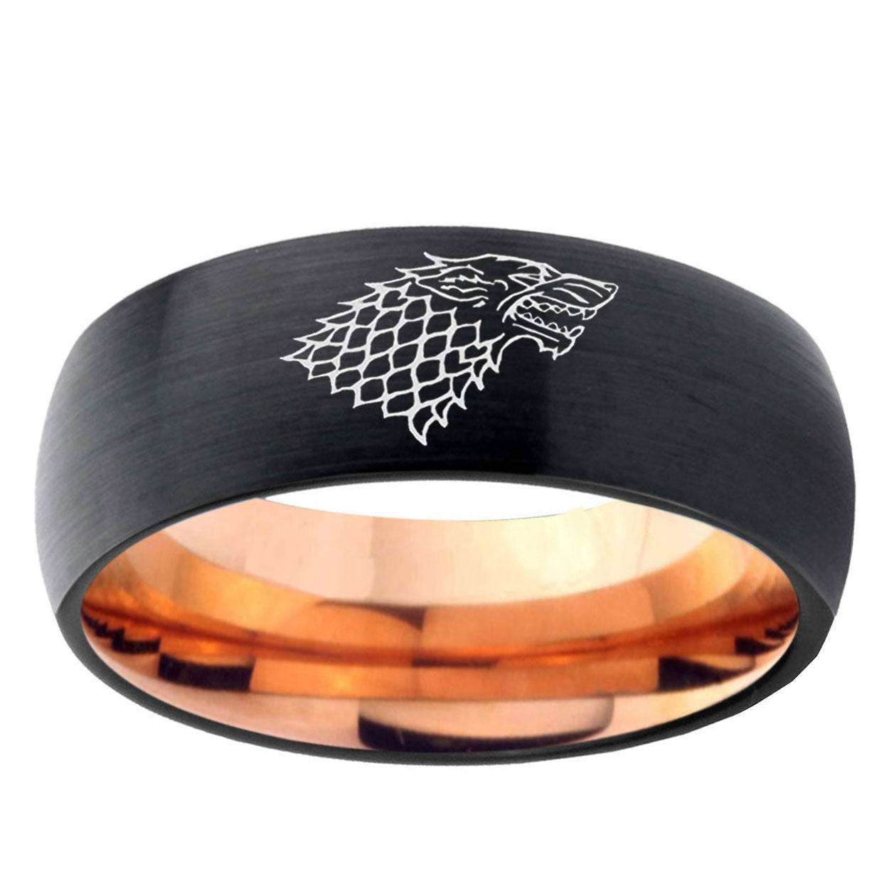 Intruding 5, 8mm Game Of Thrones House Stark Direwolf Dome Tungsten Carbide Rose Gold Anniversary Ring . Offer in both 5mm and 8mm band width black and rose gold plated finished from size 4 to 14