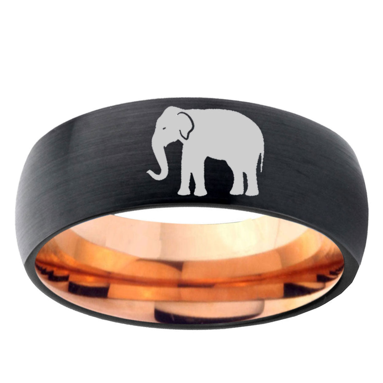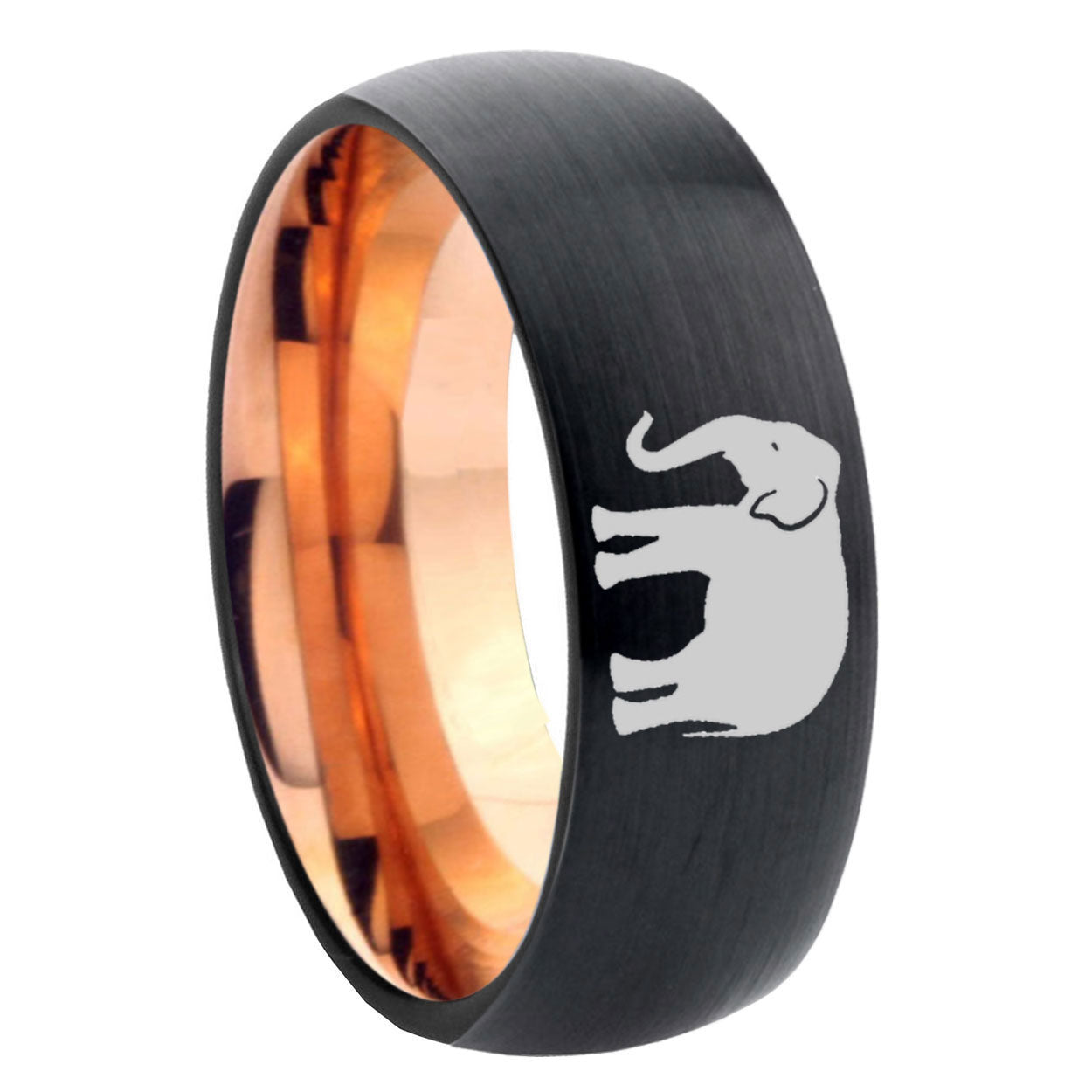 Intruding 5, 8mm Elephant Dome Tungsten Carbide Rose Gold Anniversary Ring . Offer in both 5mm and 8mm band width black and rose gold plated finished from size 4 to 14