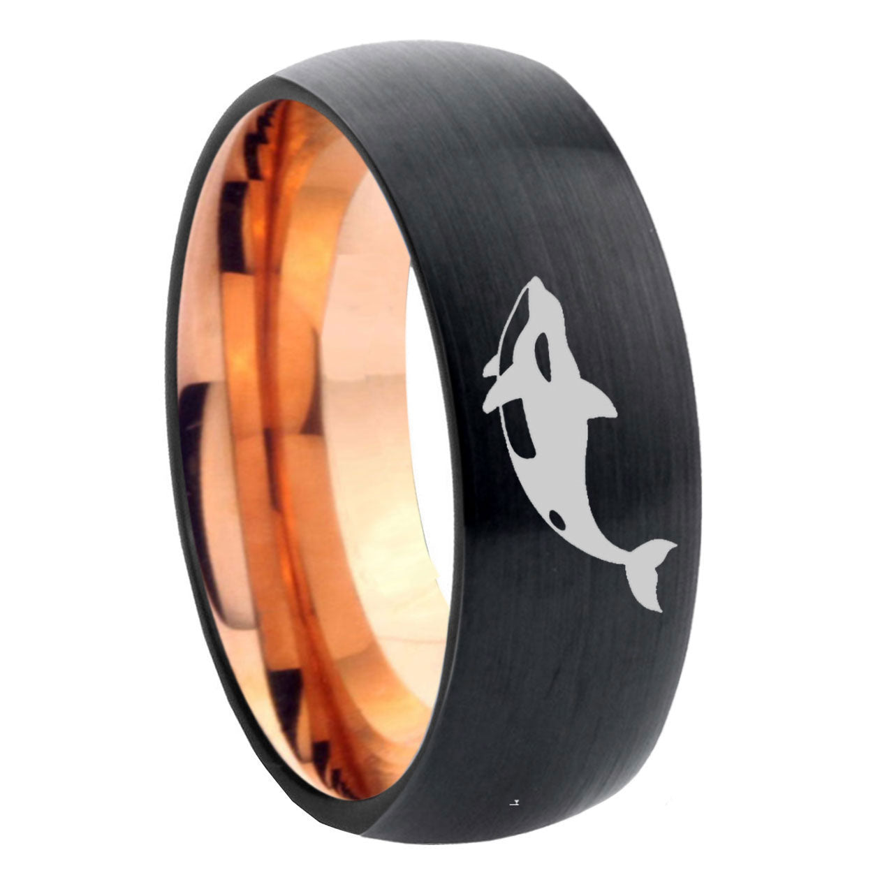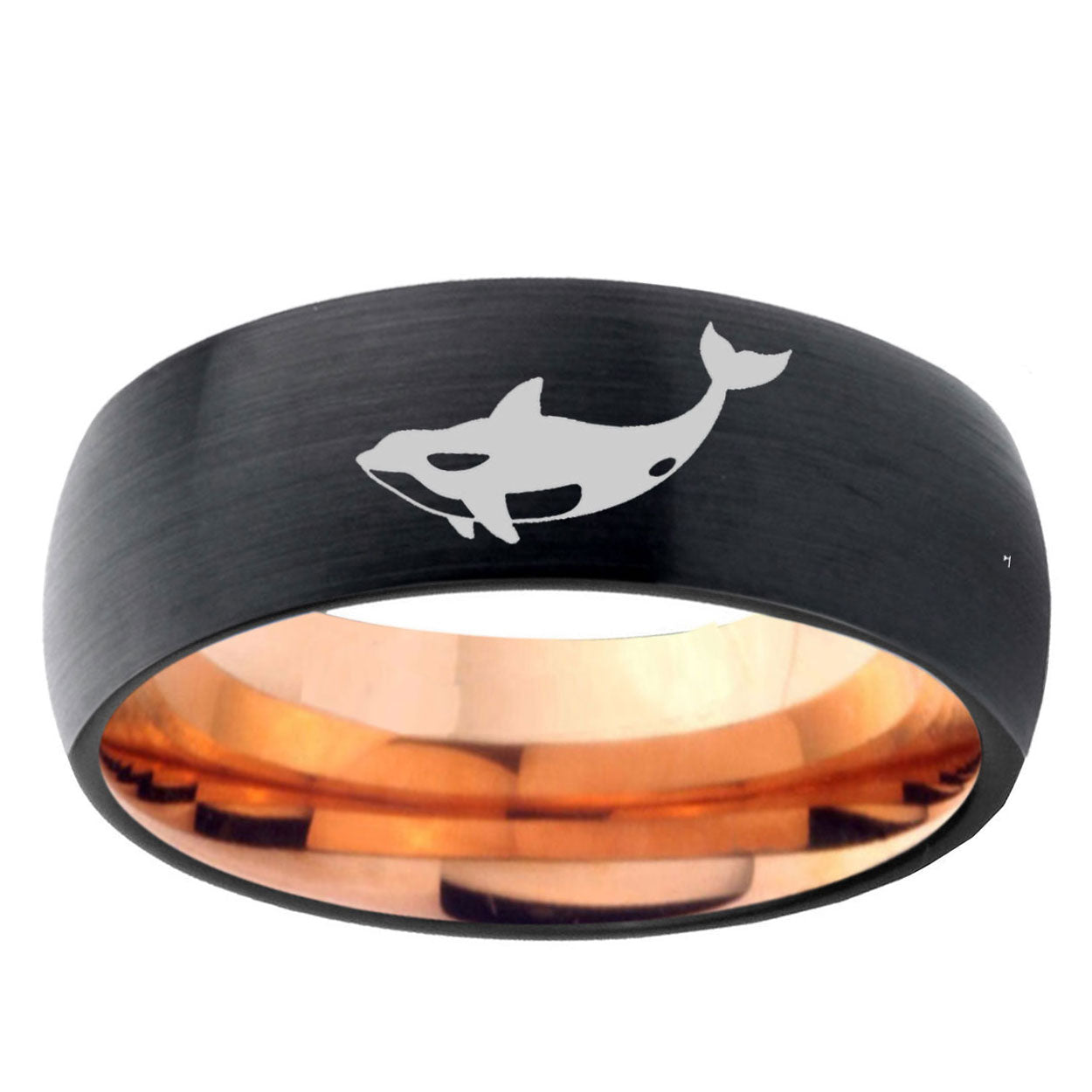 Intruding 5, 8mm Keller Whale Dome Tungsten Carbide Rose Gold Anniversary Ring . Offer in both 5mm and 8mm band width black and rose gold plated finished from size 4 to 14