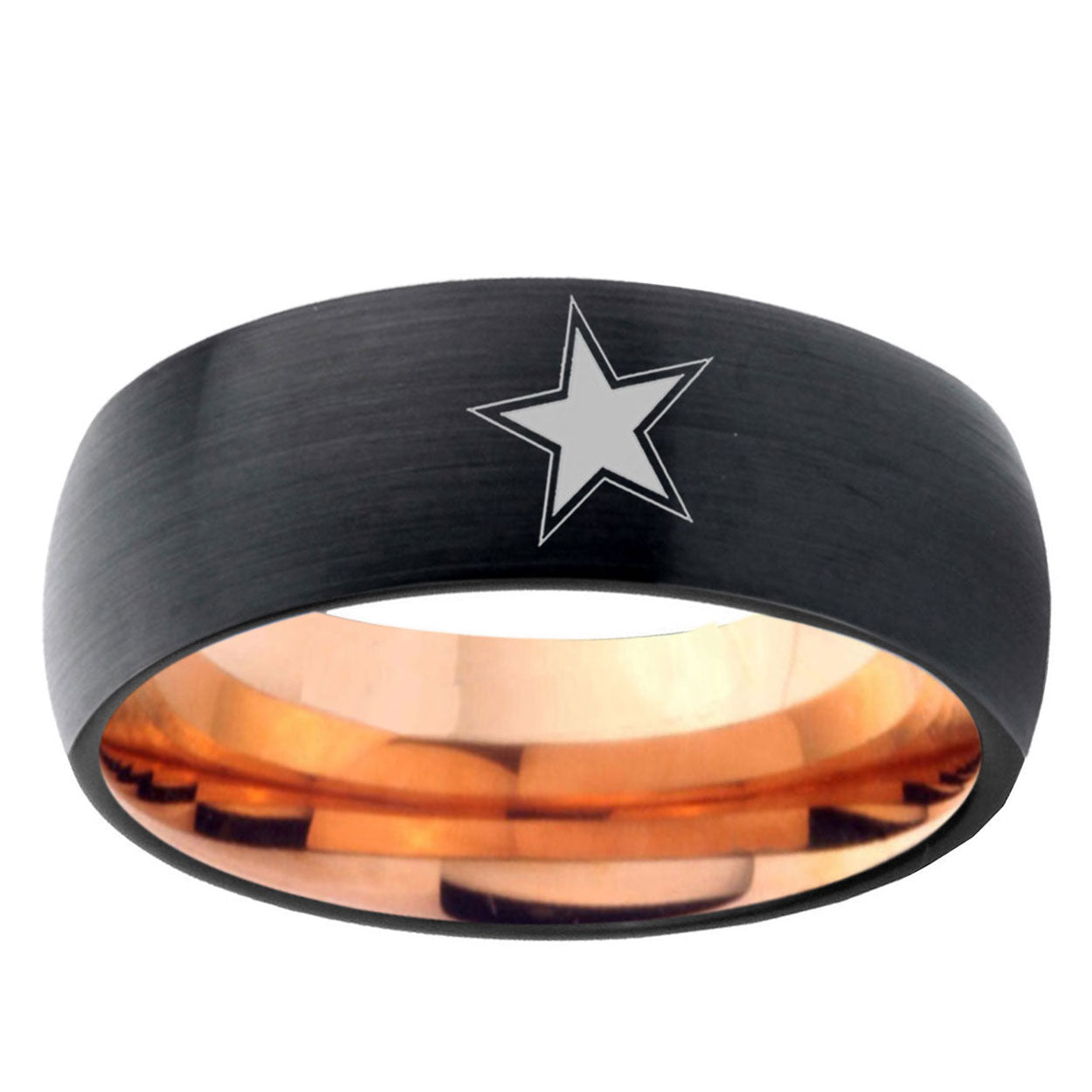 Intruding 5, 8mm Cowboys Star Dome Tungsten Carbide Rose Gold Anniversary Ring . Offer in both 5mm and 8mm band width black and rose gold plated finished from size 4 to 14