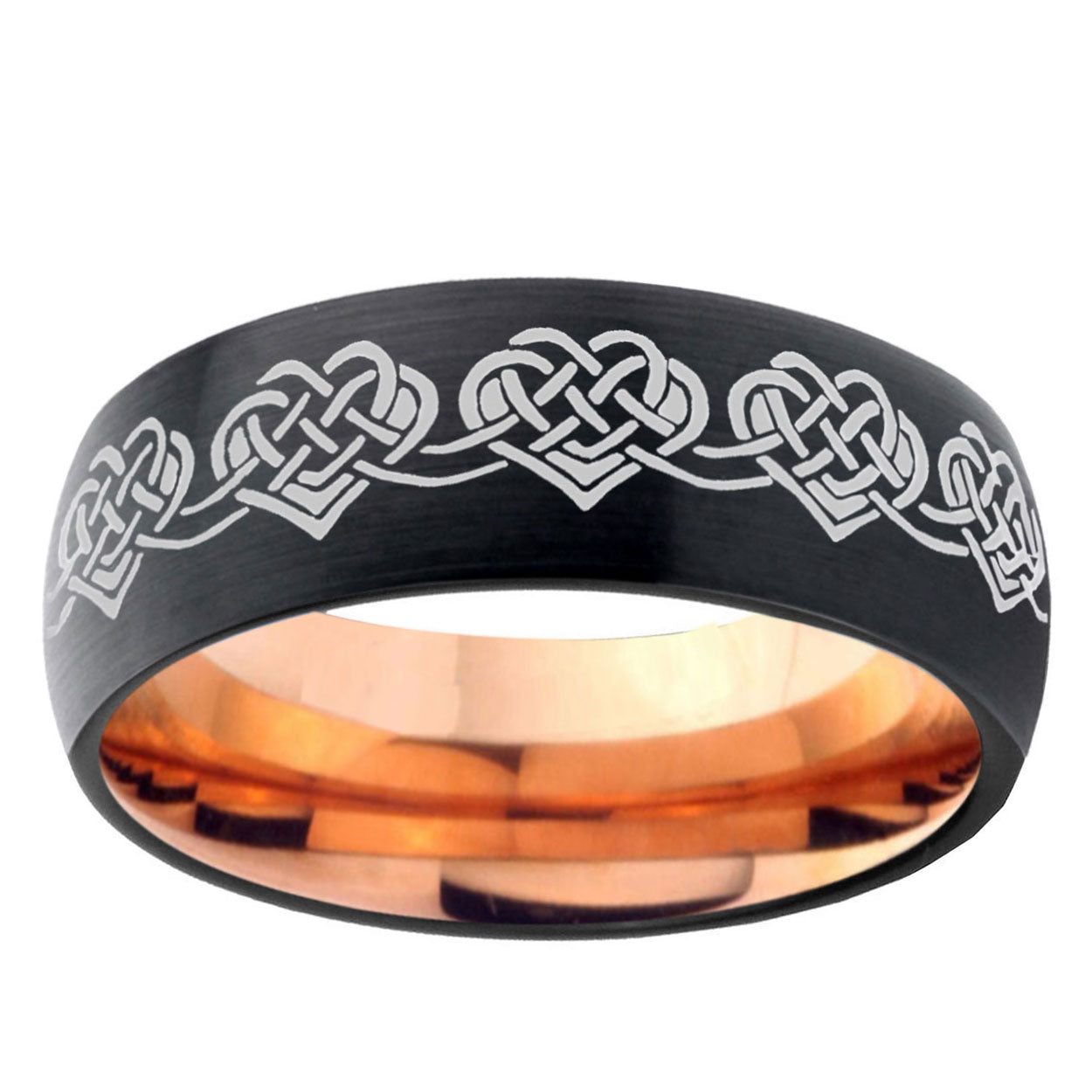 Intruding 5, 8mm Celtic Knot Heart Dome Tungsten Carbide Rose Gold Anniversary Ring . Offer in both 5mm and 8mm band width black and rose gold plated finished from size 4 to 14