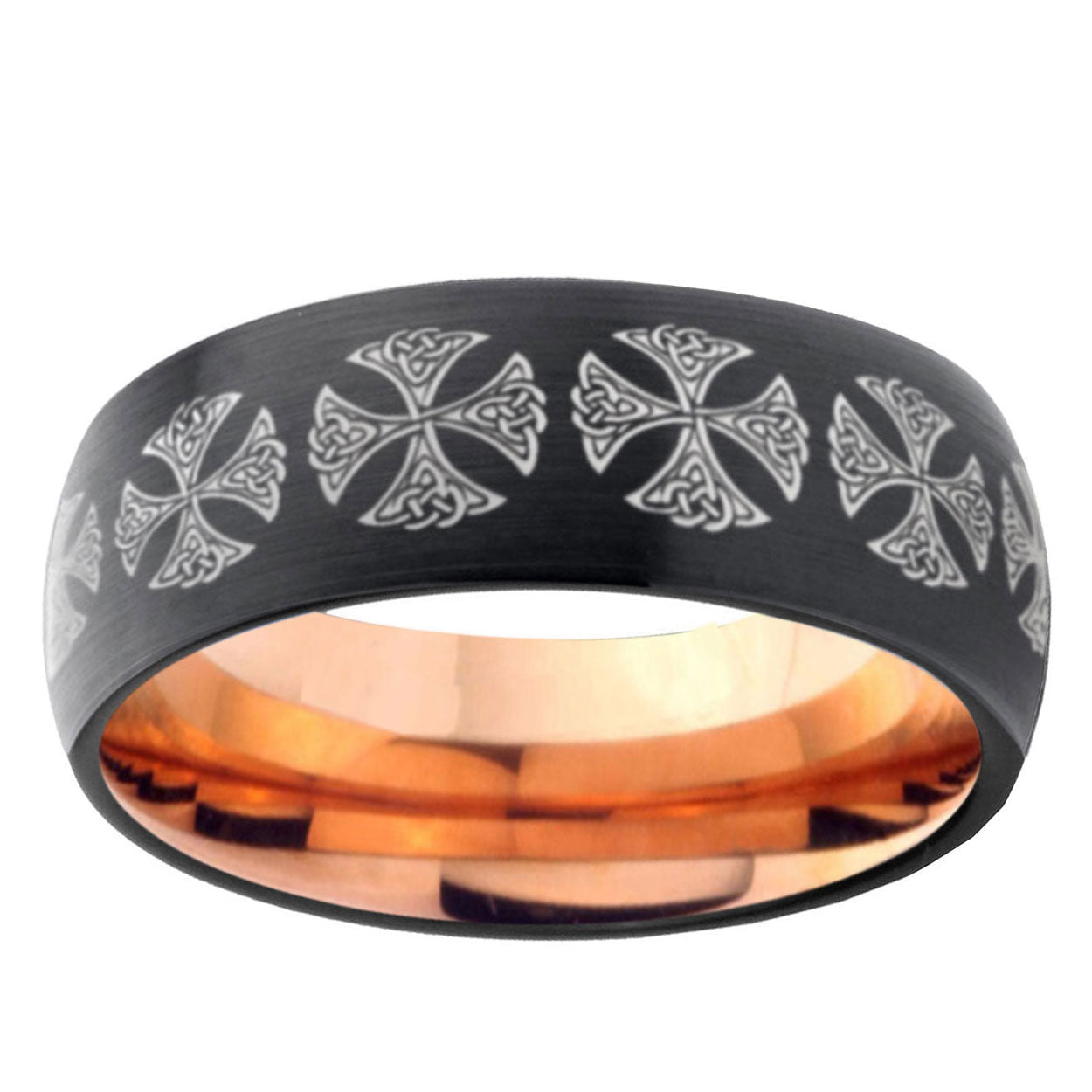 Intruding 5, 8mm Medieval Cross Dome Tungsten Carbide Rose Gold Anniversary Ring . Offer in both 5mm and 8mm band width black and rose gold plated finished from size 4 to 14