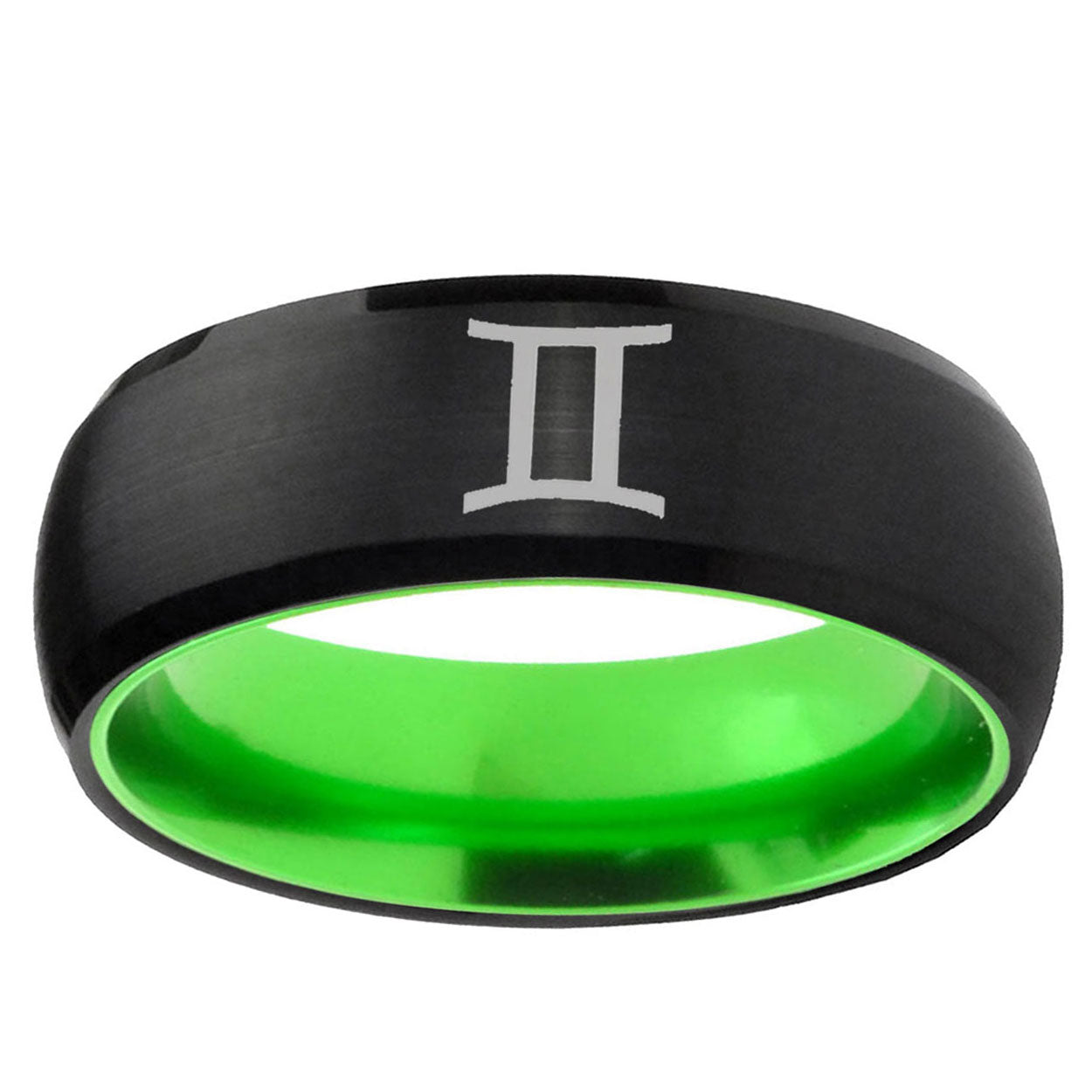 Intruding 8mm Gemini Zodiac Dome Black And Green Tungsten Wedding Engraving Ring . Offer in men wedding band in 8mm band width Black And Green plated finished from size 7 to 14