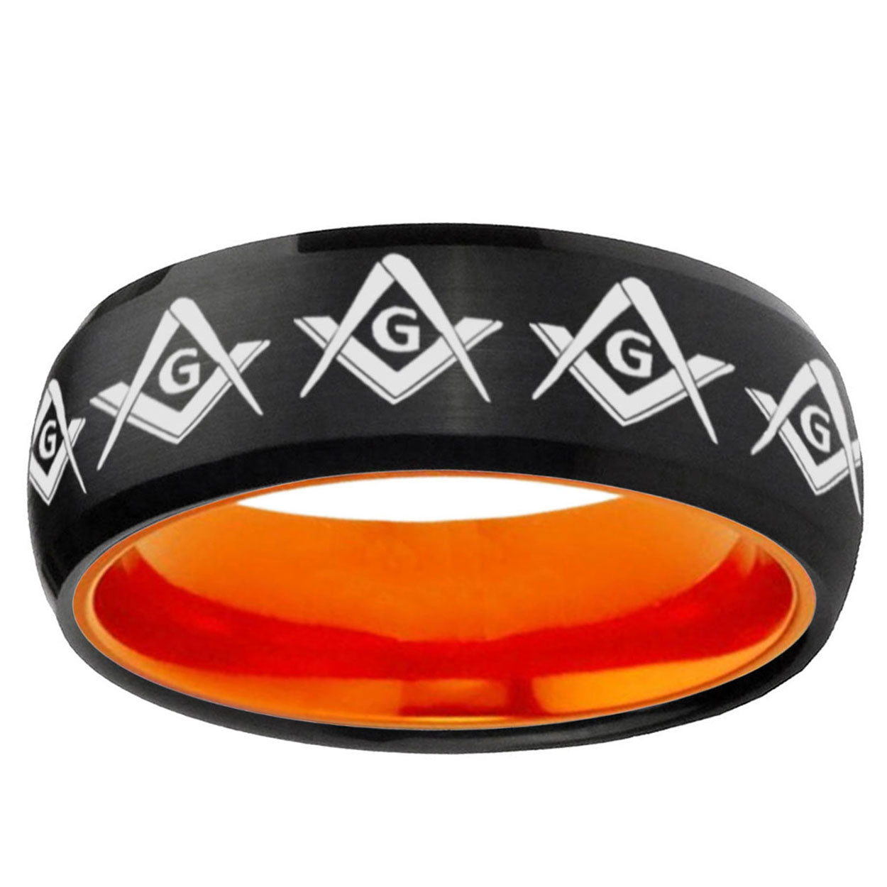 Intruding 8mm Masonic Square and Compass Dome Black And Orange Tungsten Carbide Men's Wedding Ring . Offer in men wedding band in 8mm band width Black And Orange plated finished from size 7 to 14