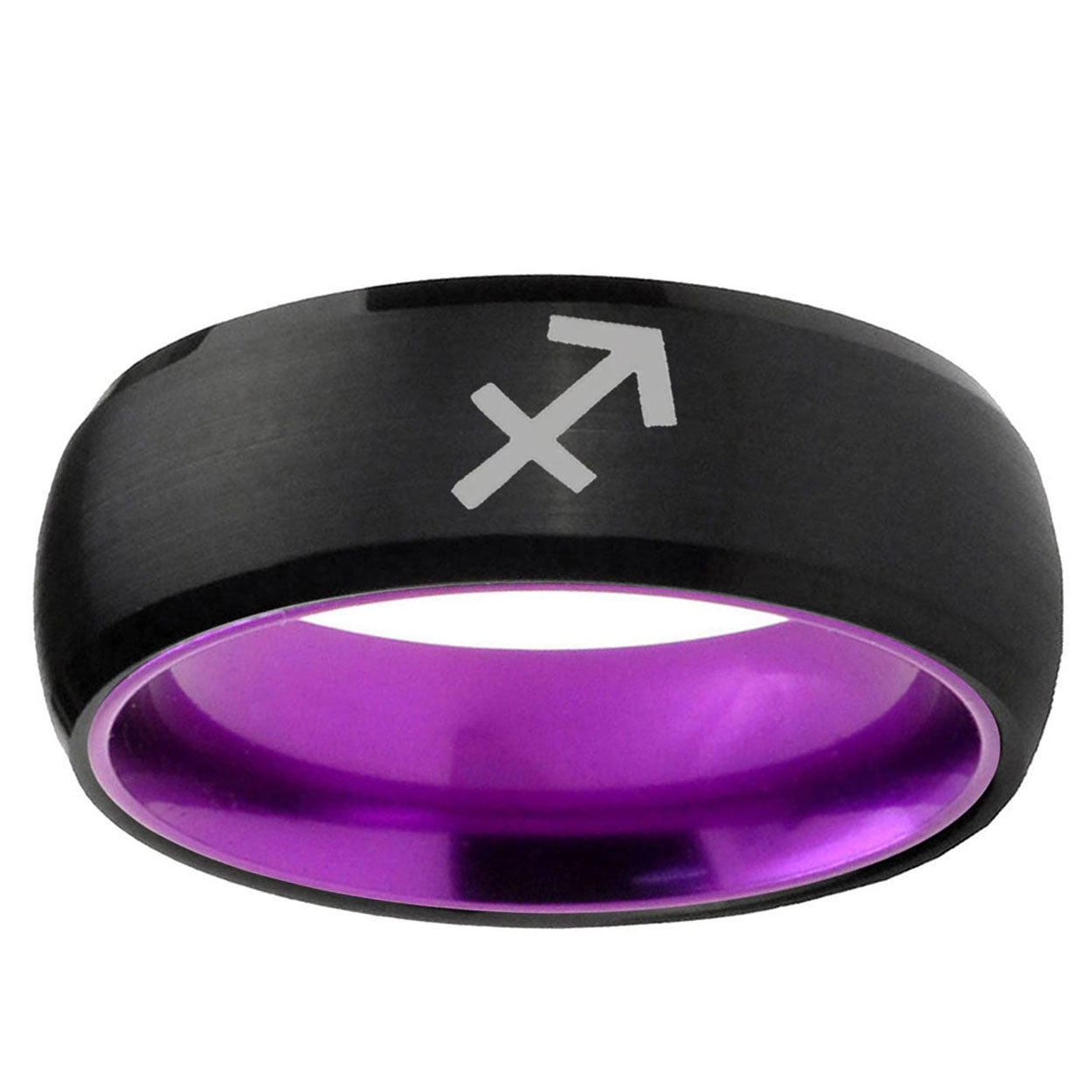 Intruding 8mm Sagittarius Zodiac Dome Black And Purple Tungsten Custom Ring for Men . Offer in men wedding band in 8mm band width Black And Purple plated finished from size 7 to 14