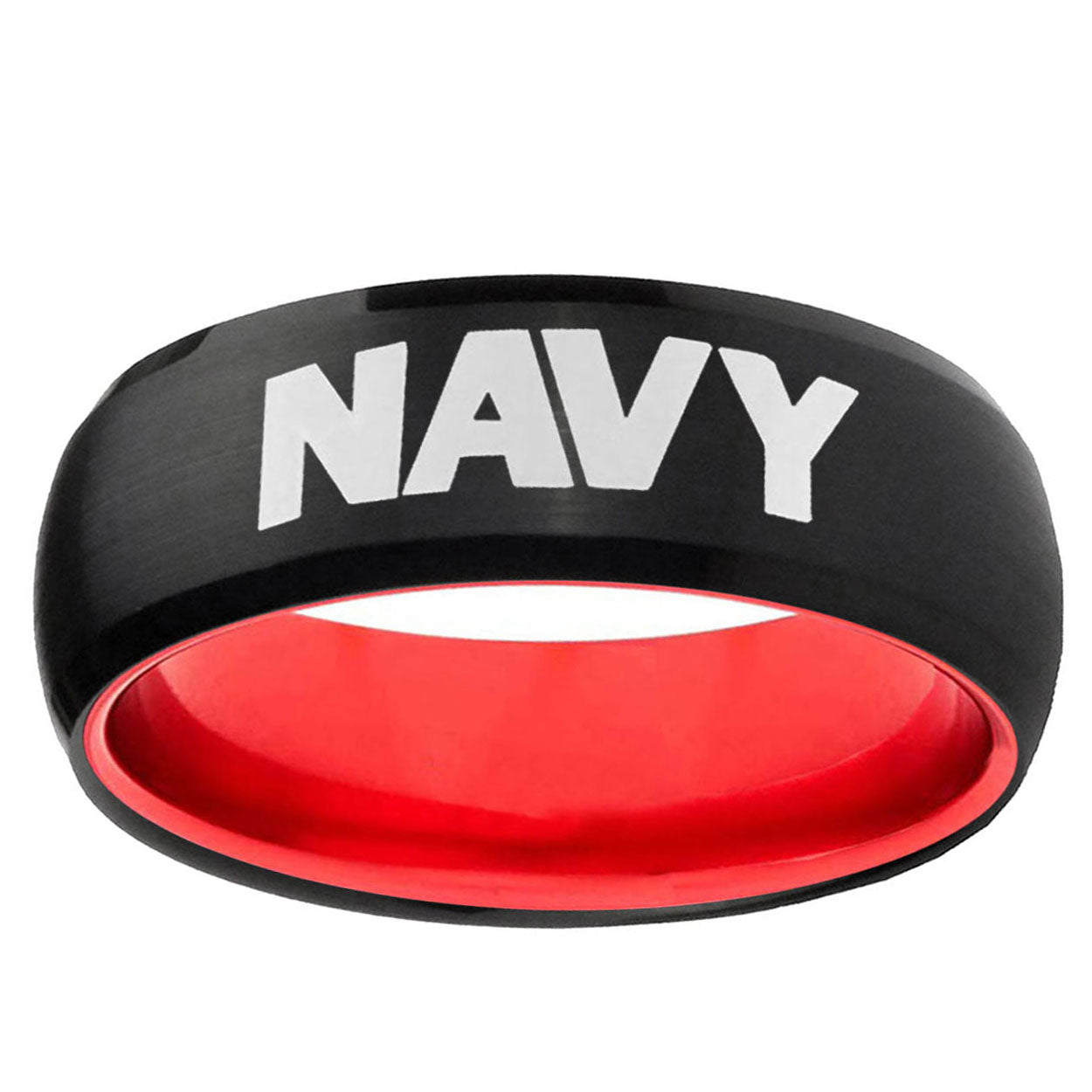 Intruding 8mm Navy Dome Black And Red Tungsten Carbide Men's Wedding Band . Offer in men wedding band in 8mm band width Black And Red plated finished from size 7 to 14